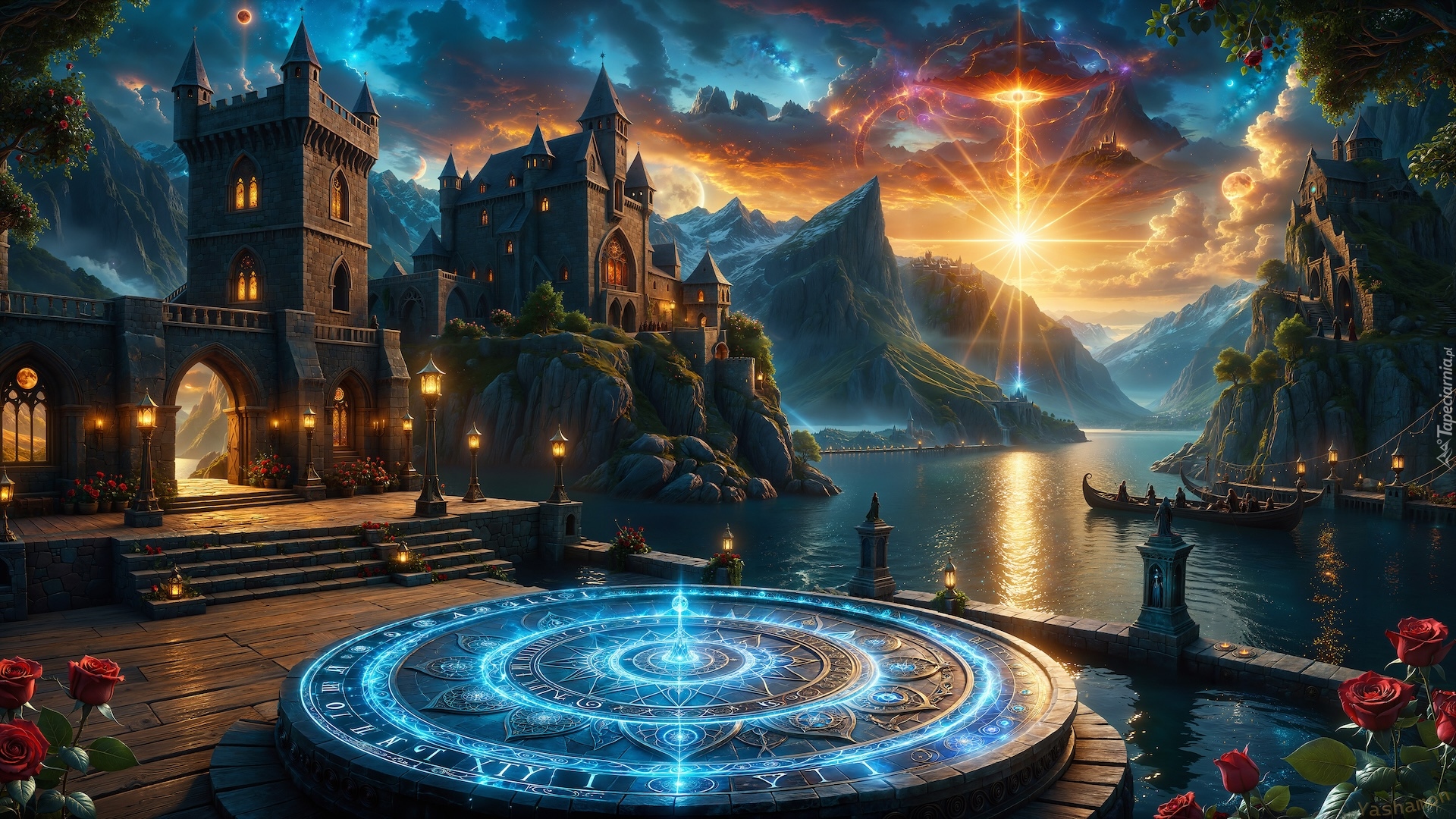 Edytor tapety: Krąg świetlny obok zamku nad jeziorem w górach
