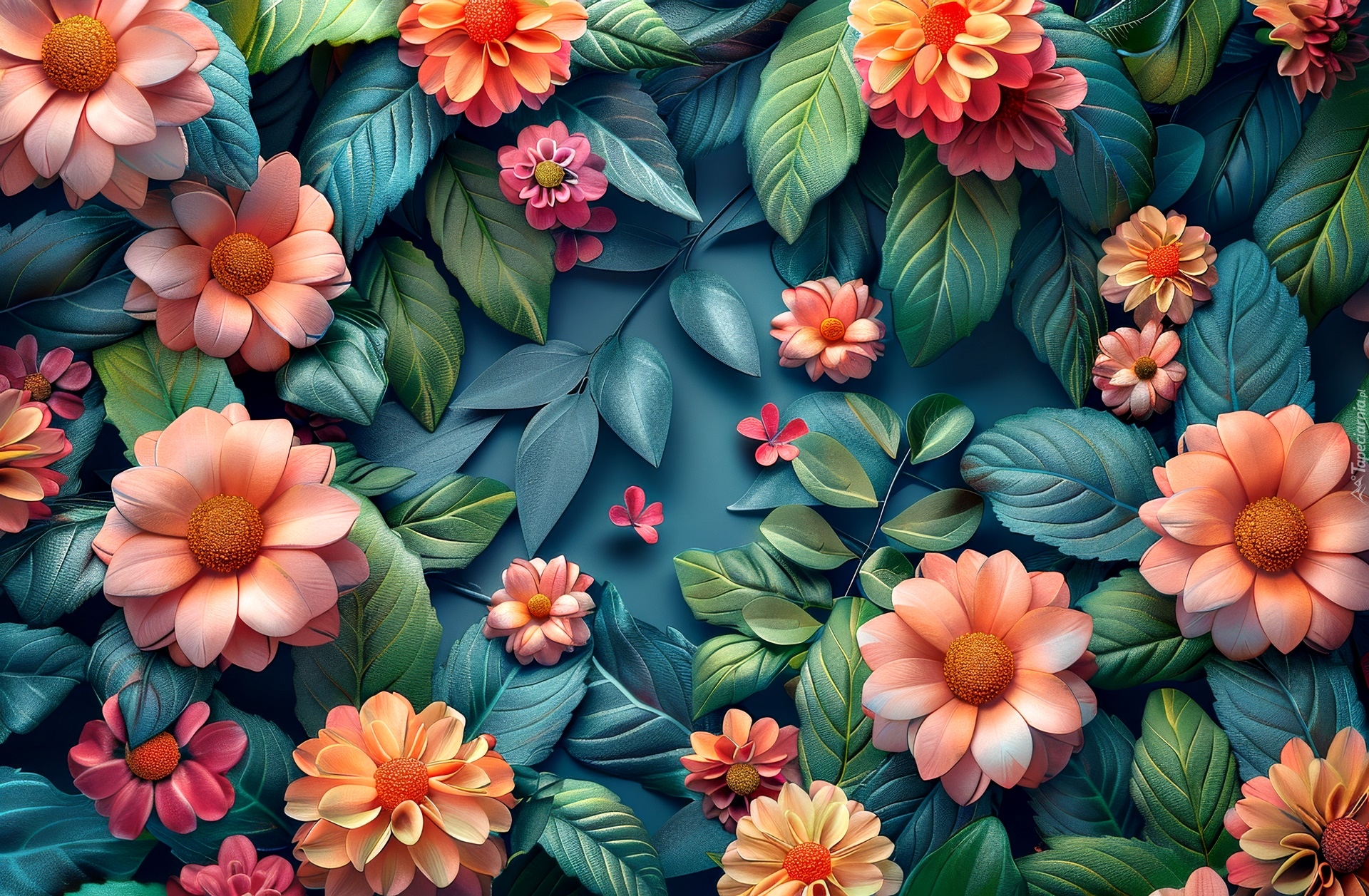 Edytor tapety: Kolorowe kwiaty ułożone na liściach