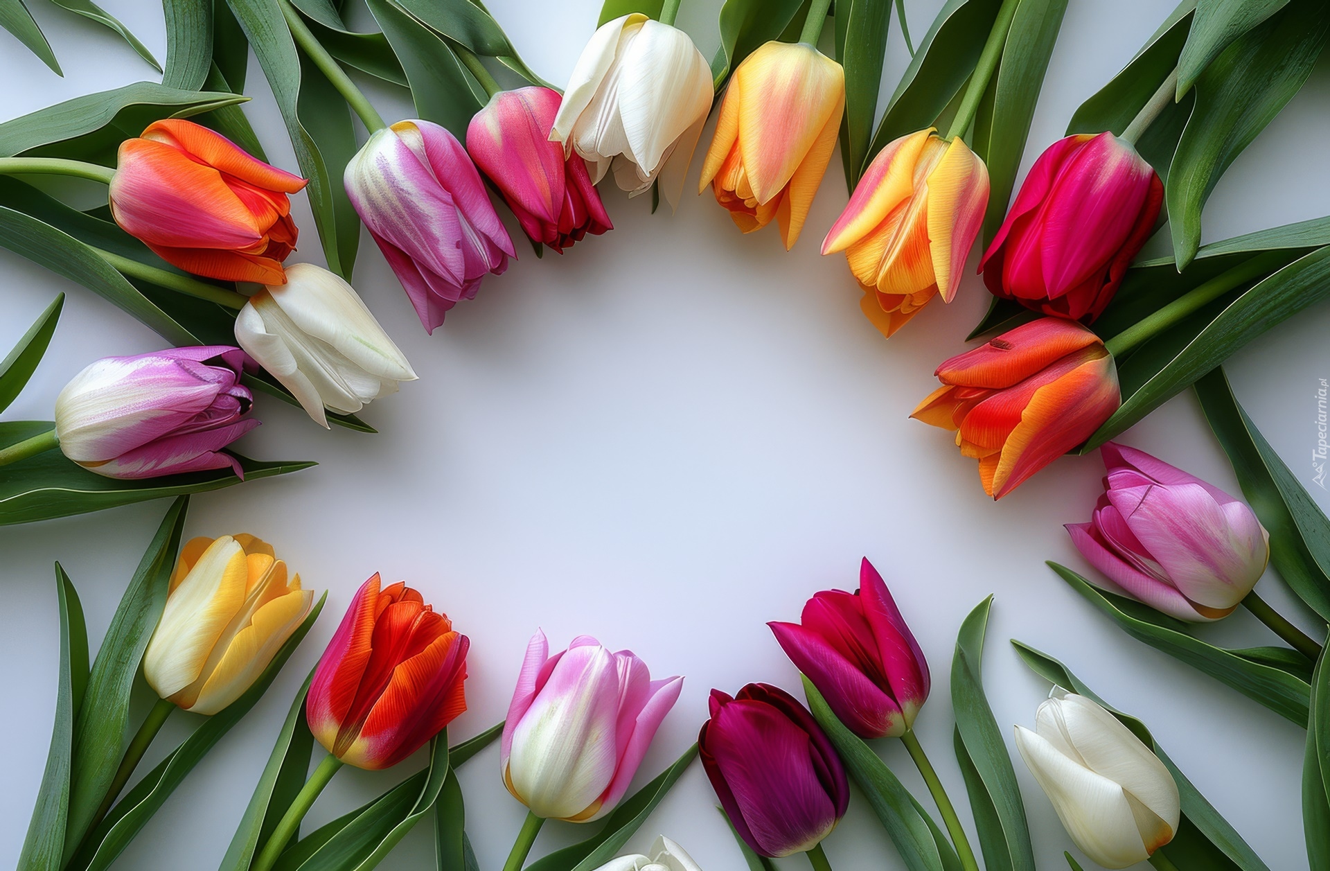 Edytor tapety: Różnokolorowe tulipany na jasnym tle