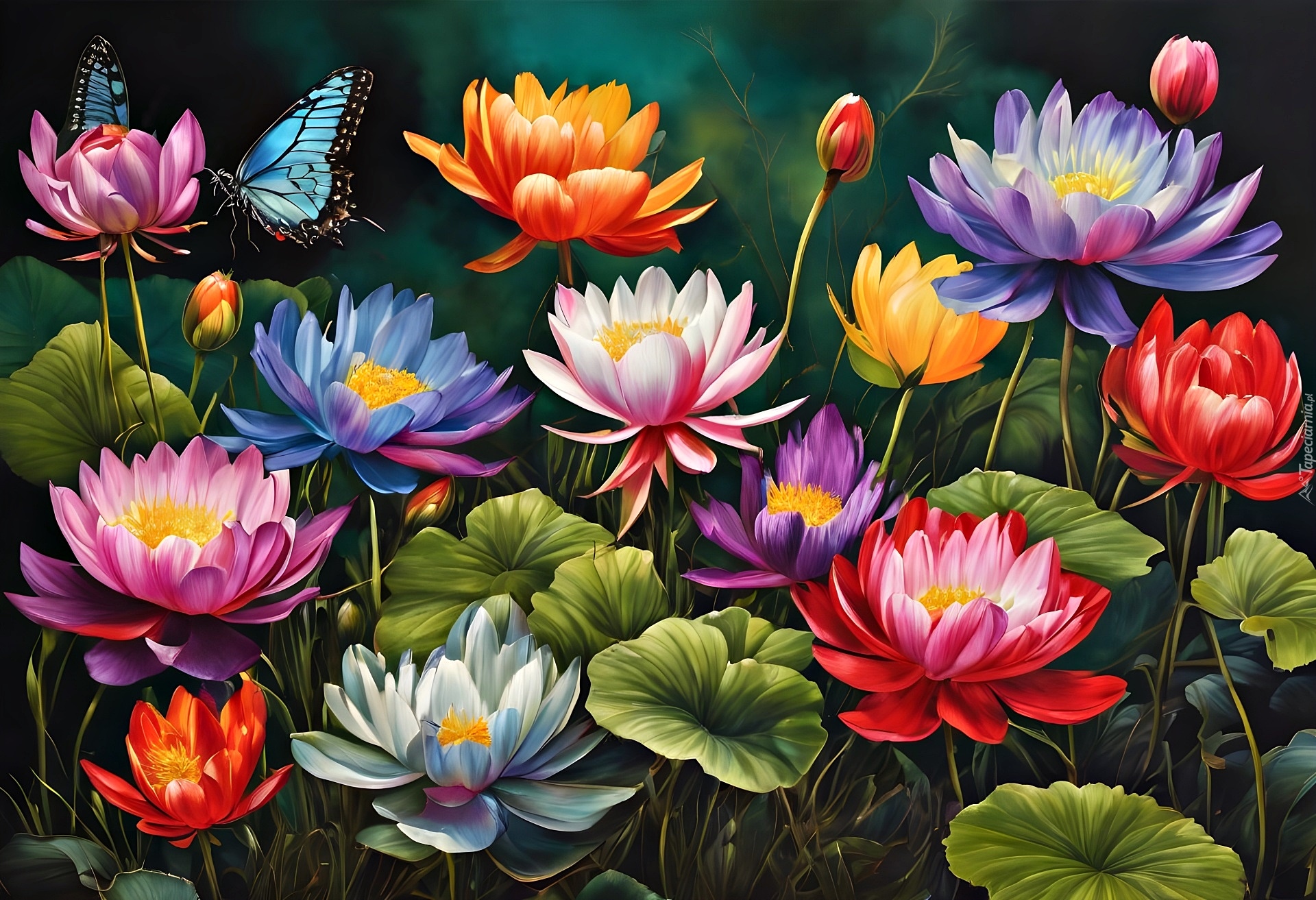 Edytor tapety: Różnokolorowe kwiaty i motyle na ciemnym tle
