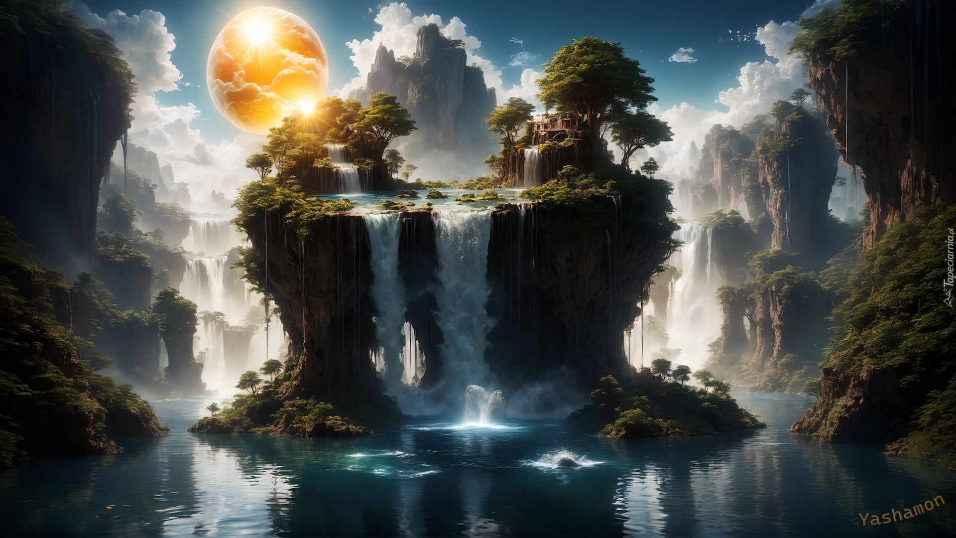Edytor tapety: Wodospady na skale w blasku słońca