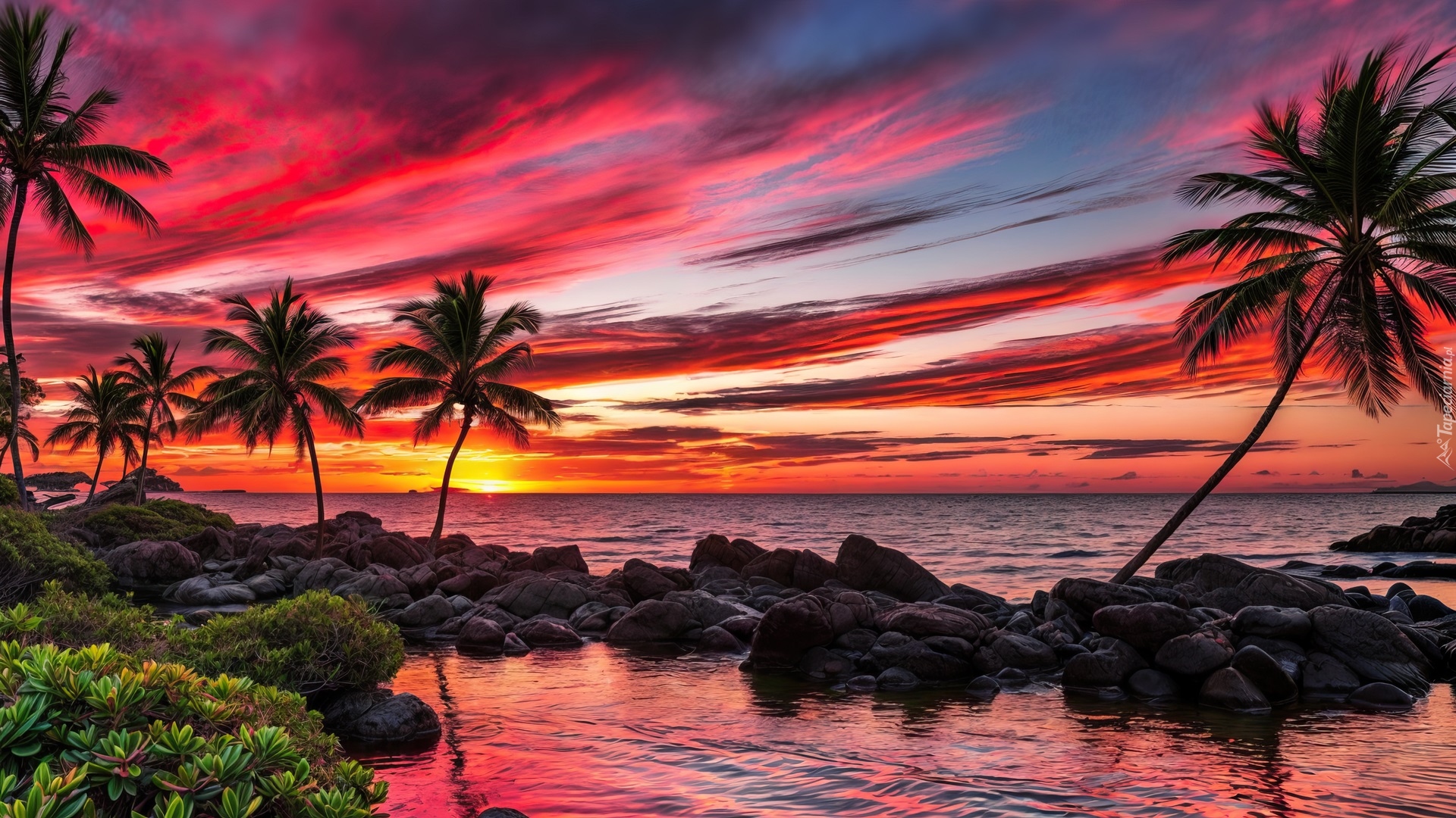 Edytor tapety: Kolorowe niebo nad morzem i palmami
