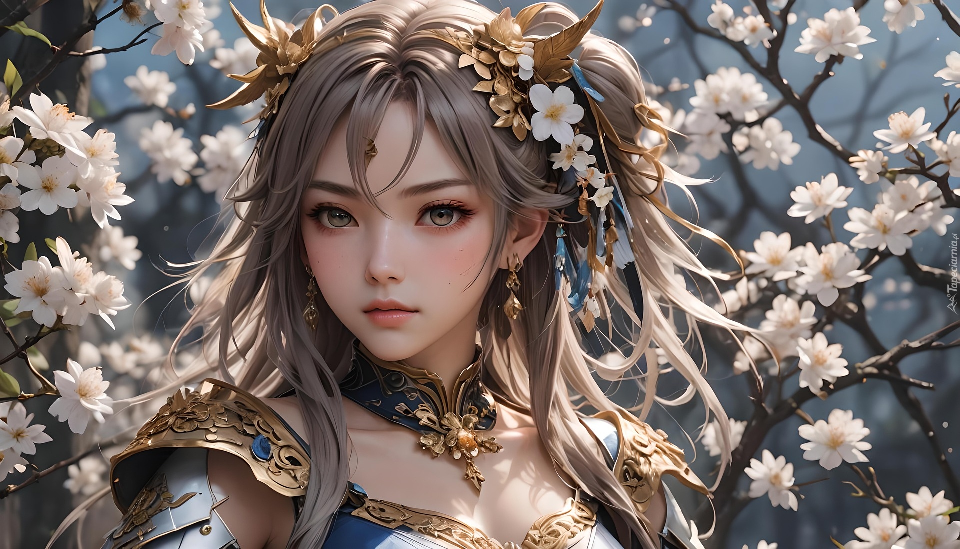 Edytor tapety: Twarz kobiety wśród ukwieconych białymi kwiatkami gałązek