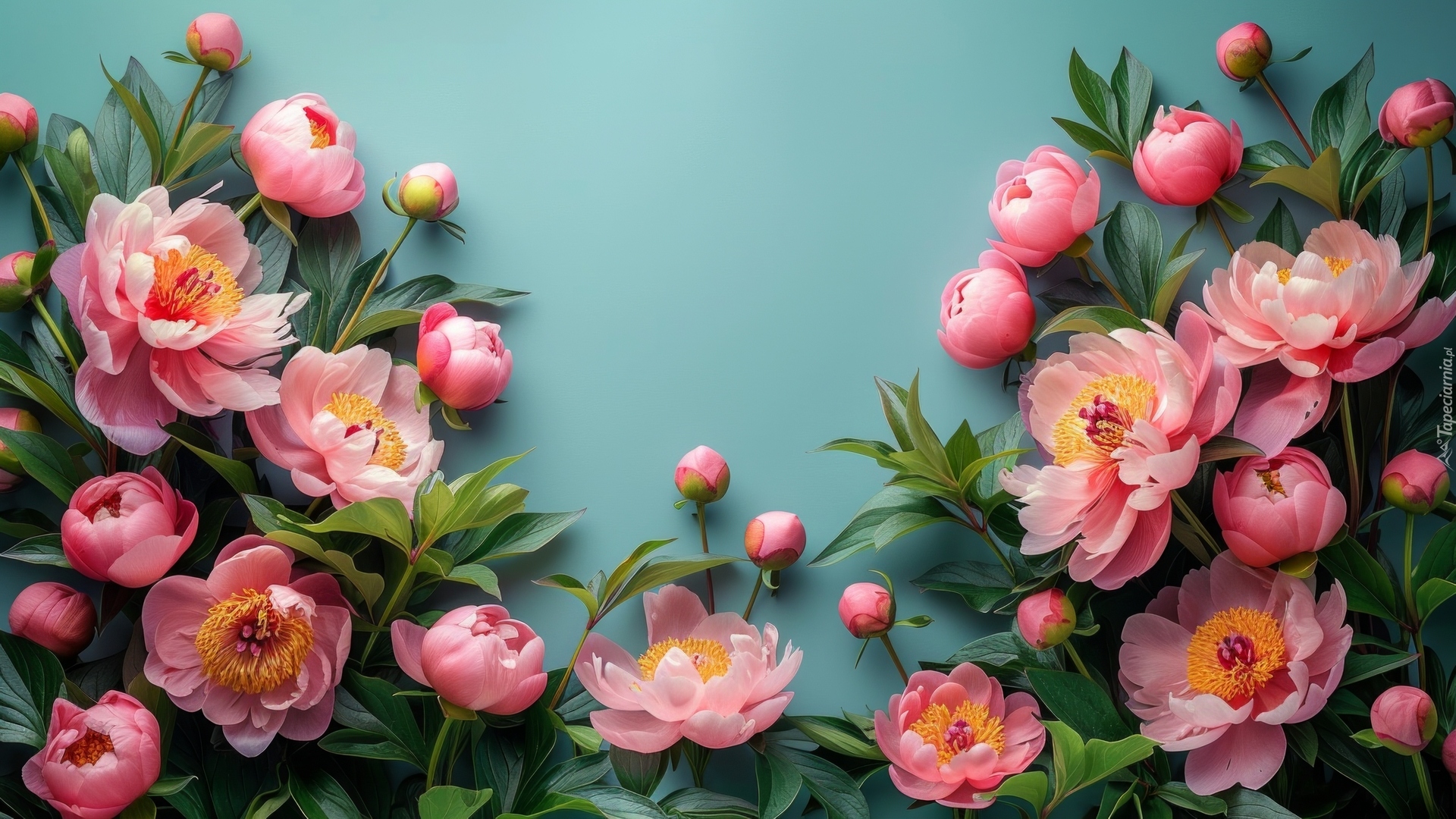 Edytor tapety: Piwonie w rozkwicie na niebieskim tle