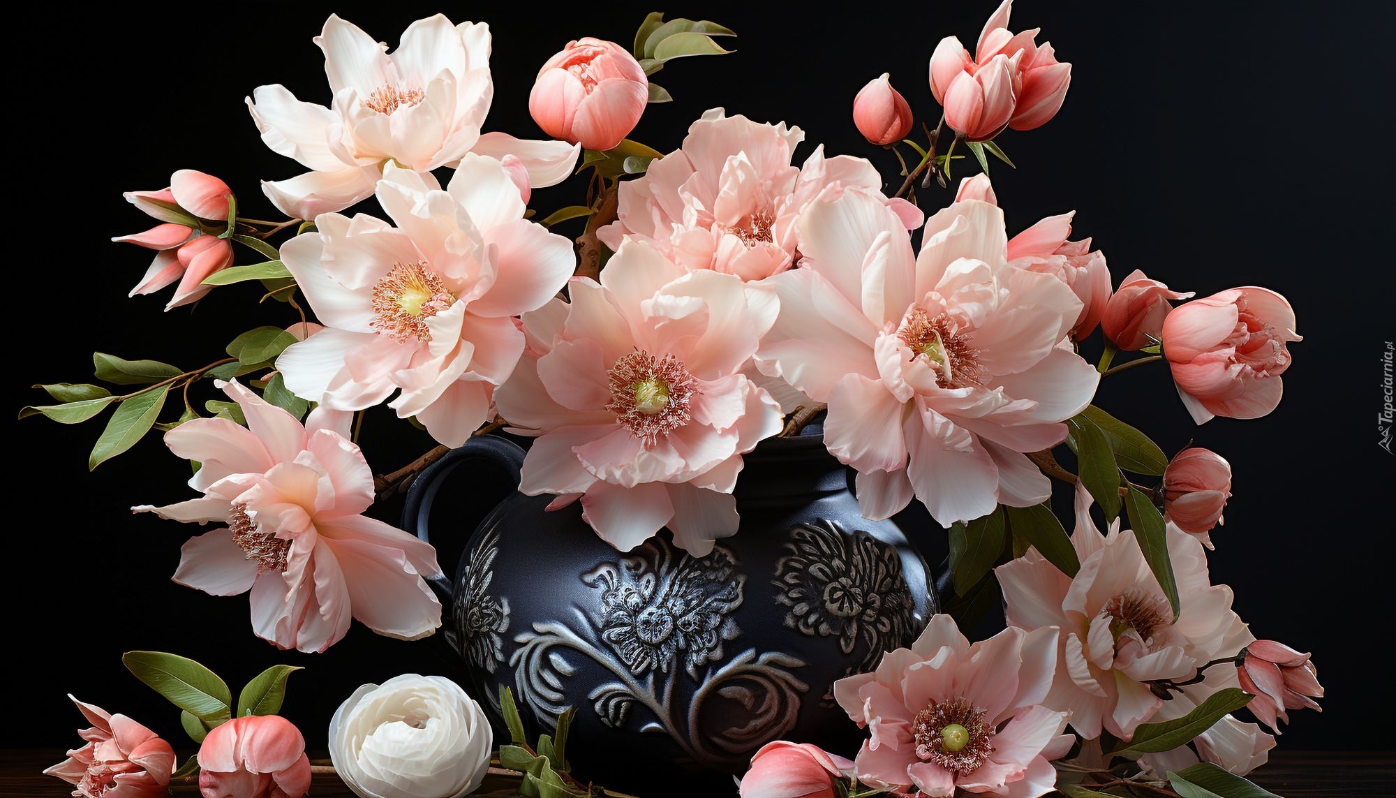 Edytor tapety: Różowe kwiaty z pąkami w ozdobnym dzbanku