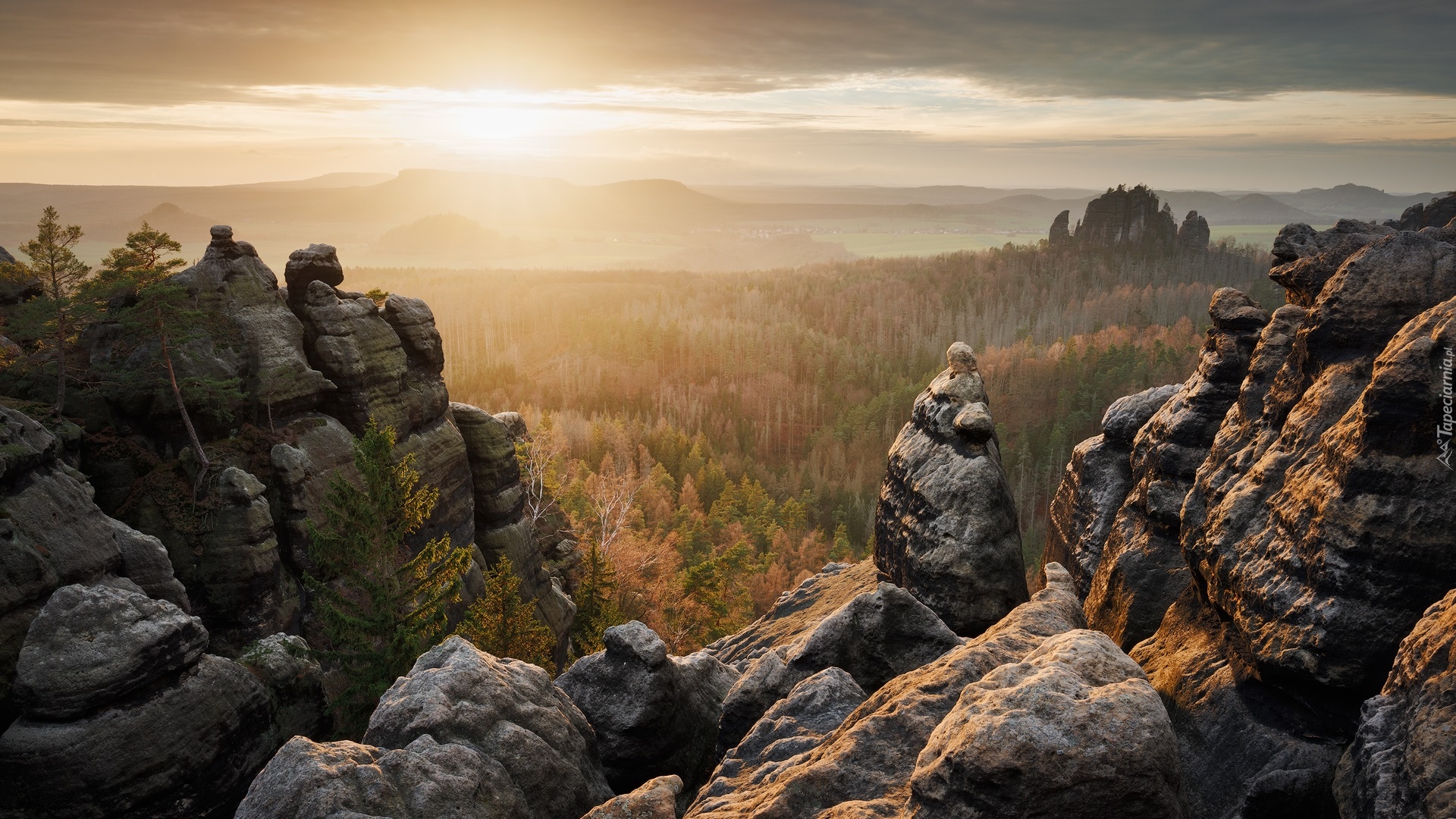 Edytor tapety: Rozświetlone porannym słońcem skały w Górach Połabskich
