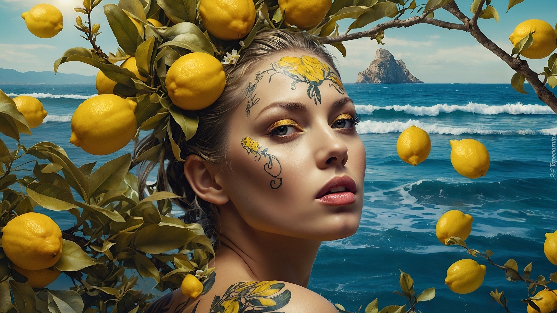 Edytor tapety: Twarz kobiety i gałązki z cytrynami