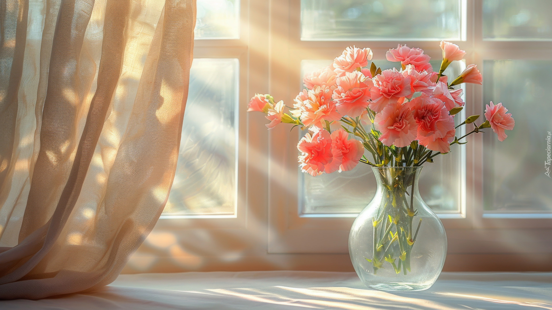 Edytor tapety: Goździki w szklanym wazonie przy oknie