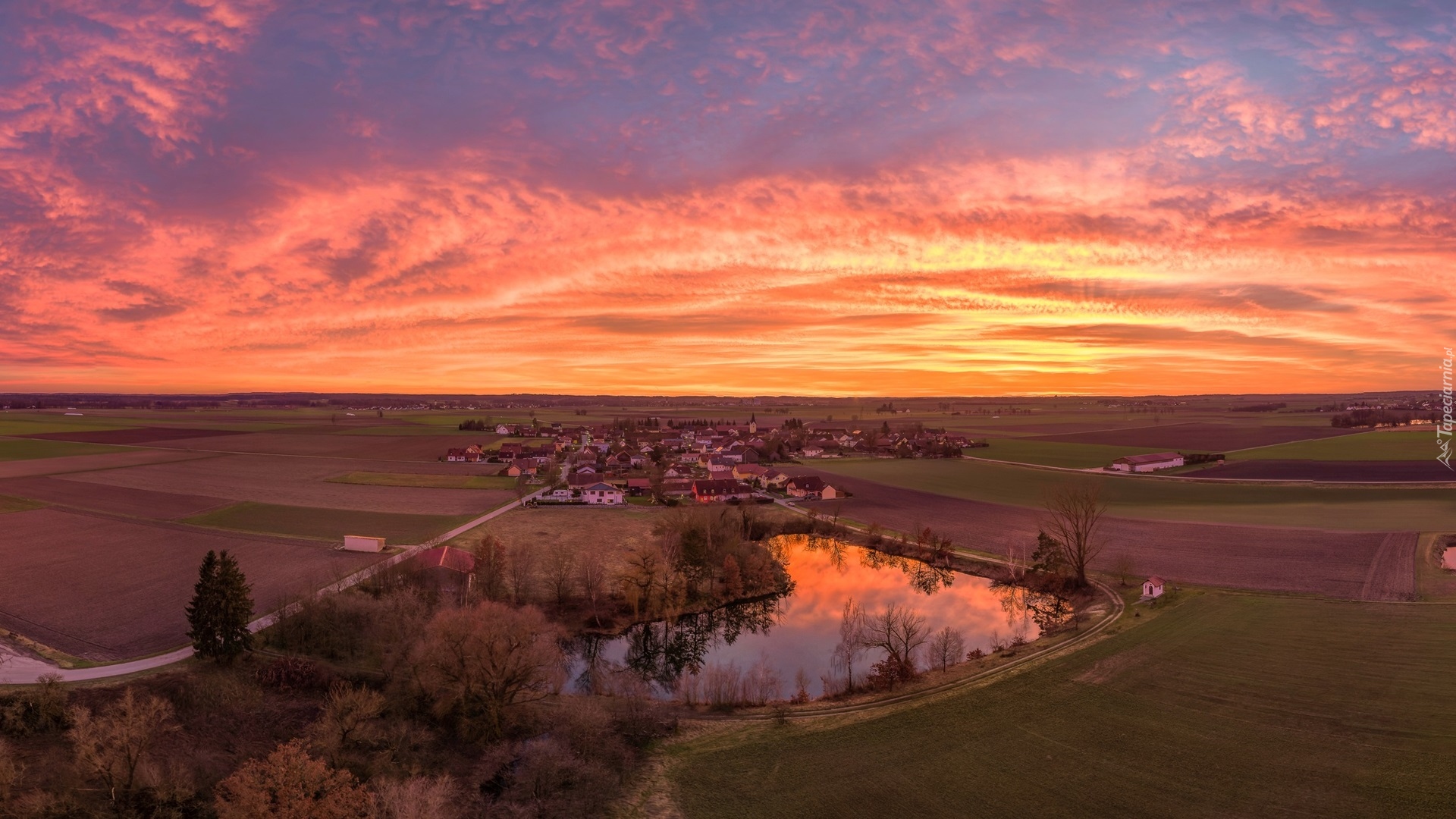 Edytor tapety: Kolorowe niebo nad domami i stawem