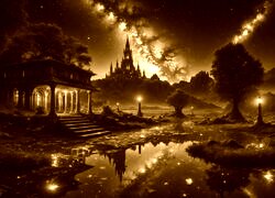 Edytor tapety: Zamek na wzgórzu i dom nad rzeką
