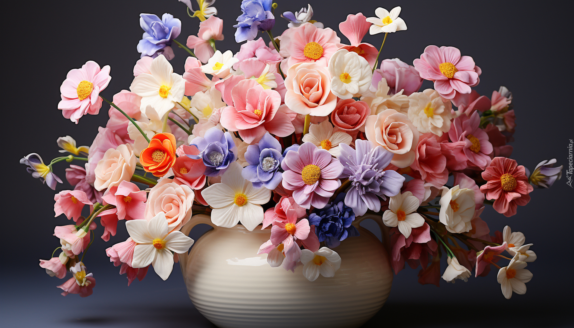 Edytor tapety: Kolorowy bukiet w białym wazonie na ciemnym tle
