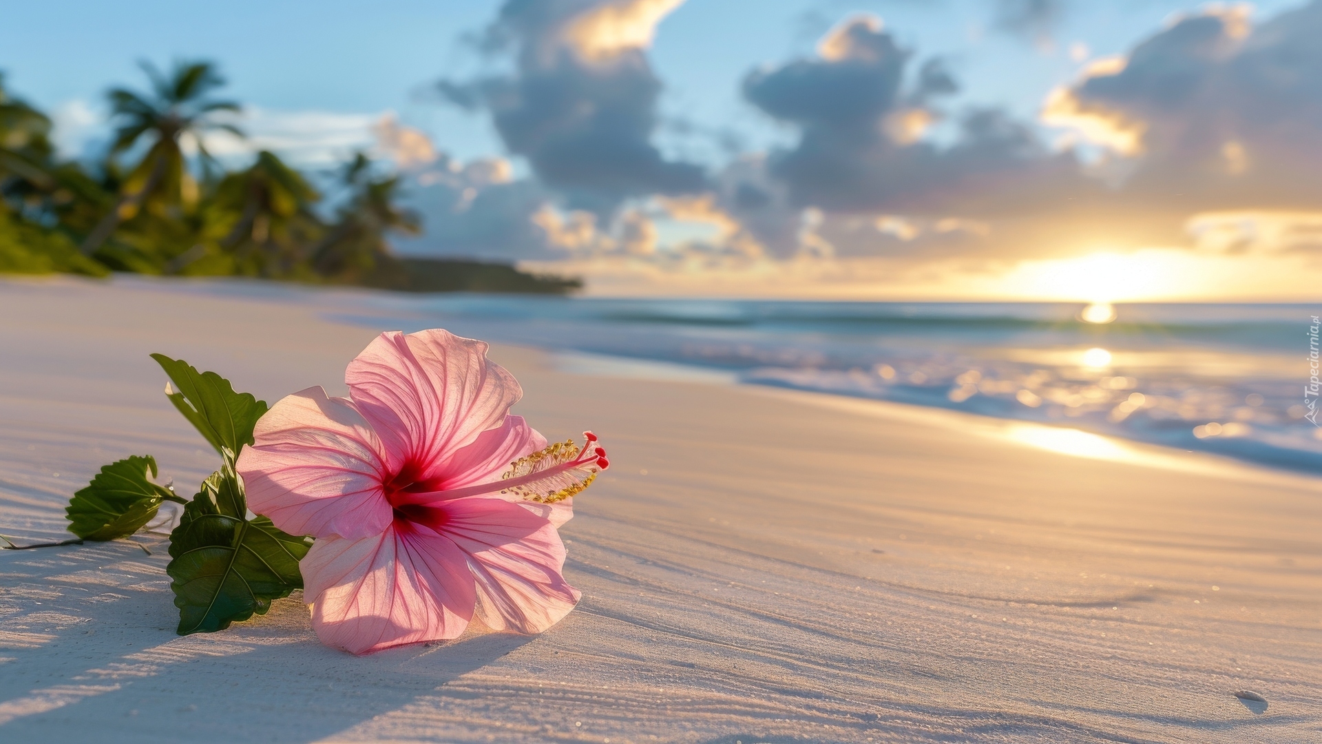 Edytor tapety: Rozświetlony różowy kwiat hibiskusa na morskiej plaży