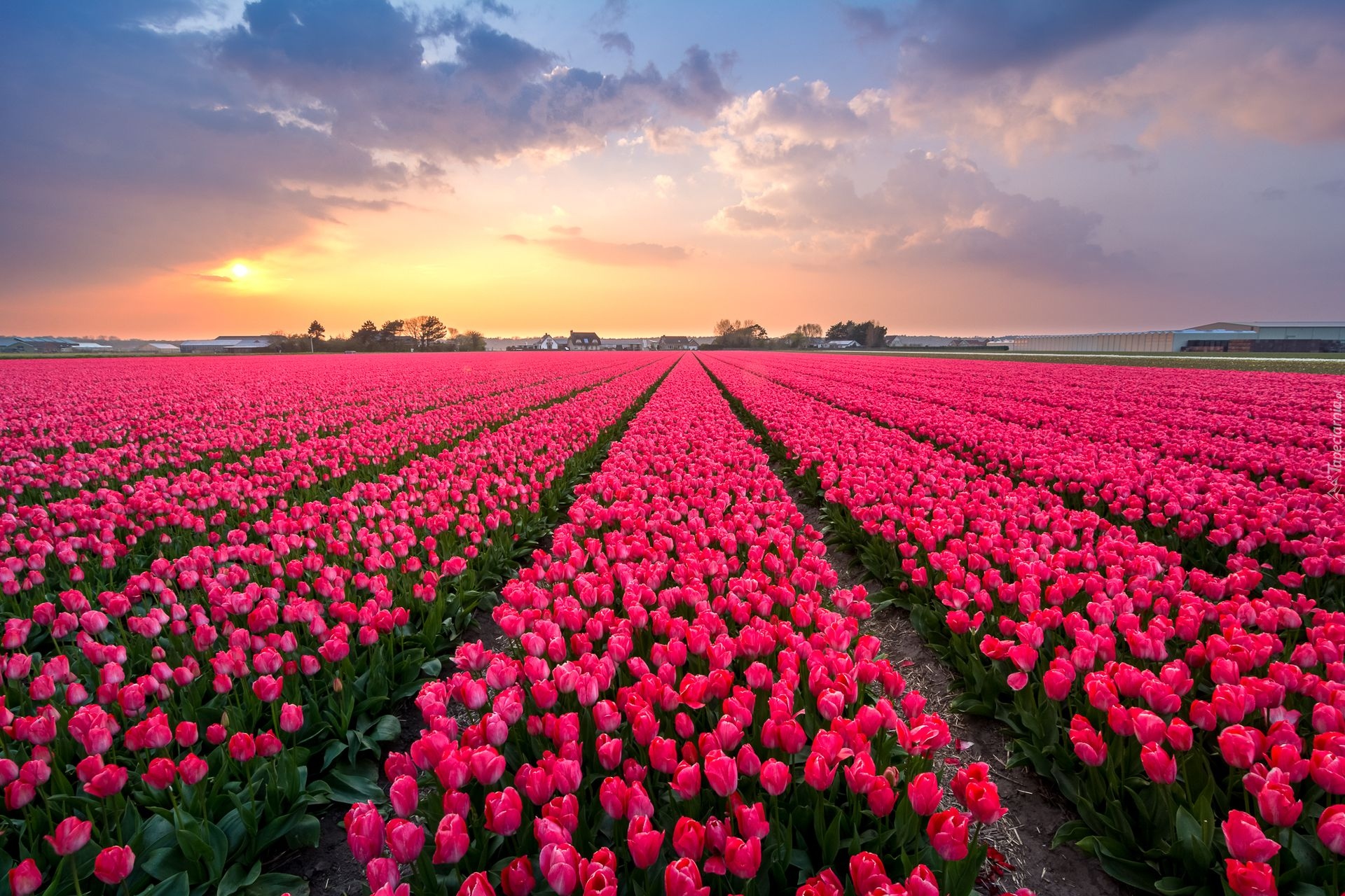 Edytor tapety: Chmury nad plantacją różowych tulipanów
