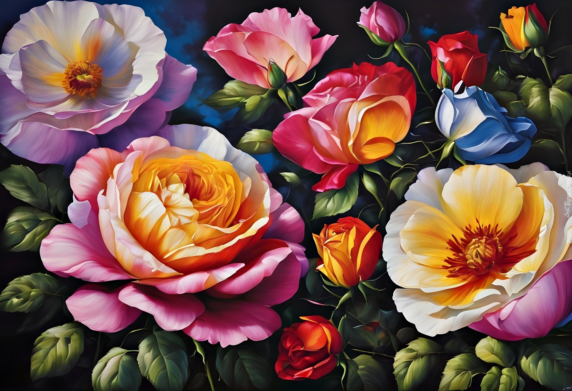 Edytor tapety: Rozwinięte kolorowe róże i pąki w grafice