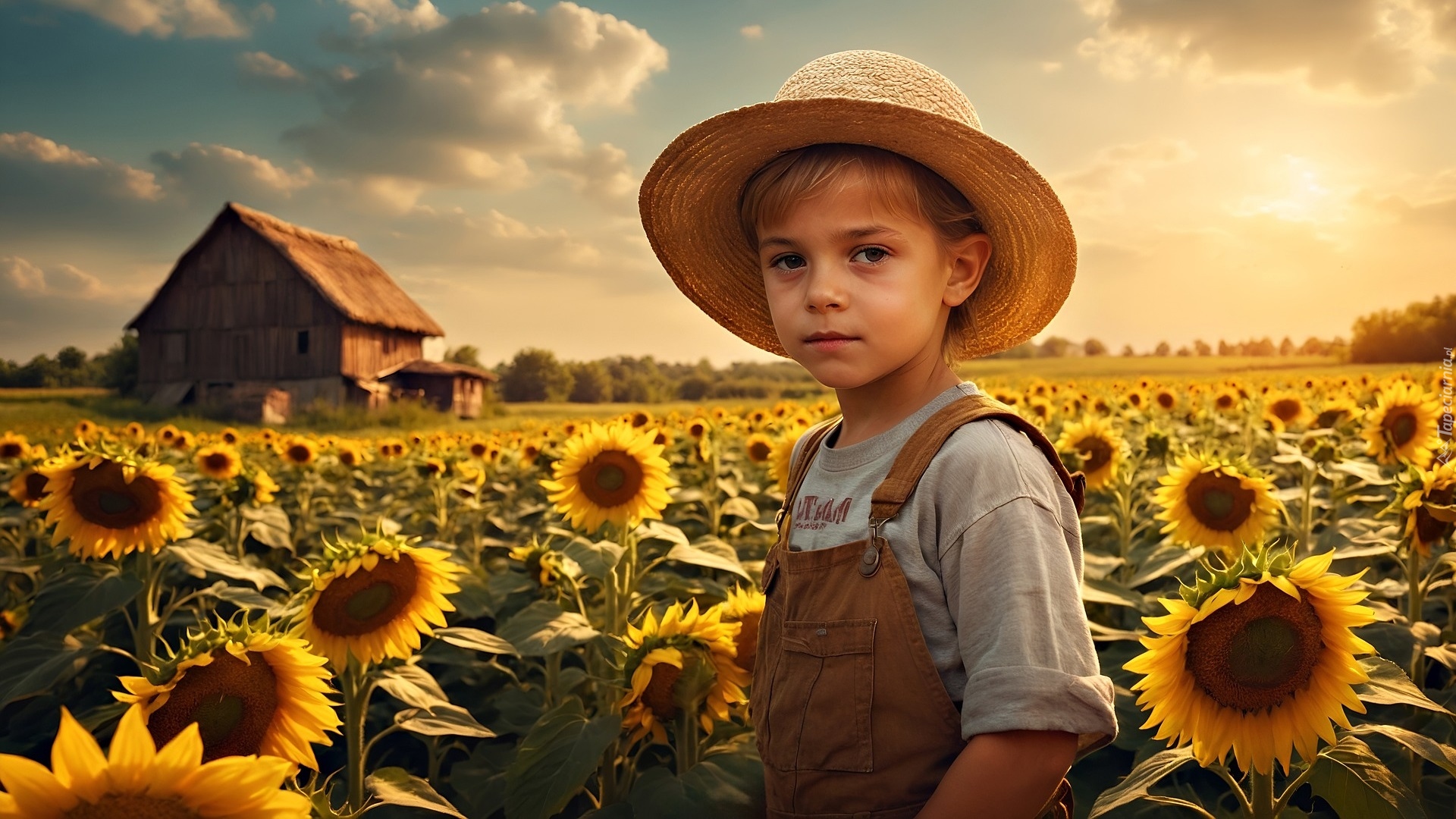 Edytor tapety: Dom i chłopiec wśród słoneczników