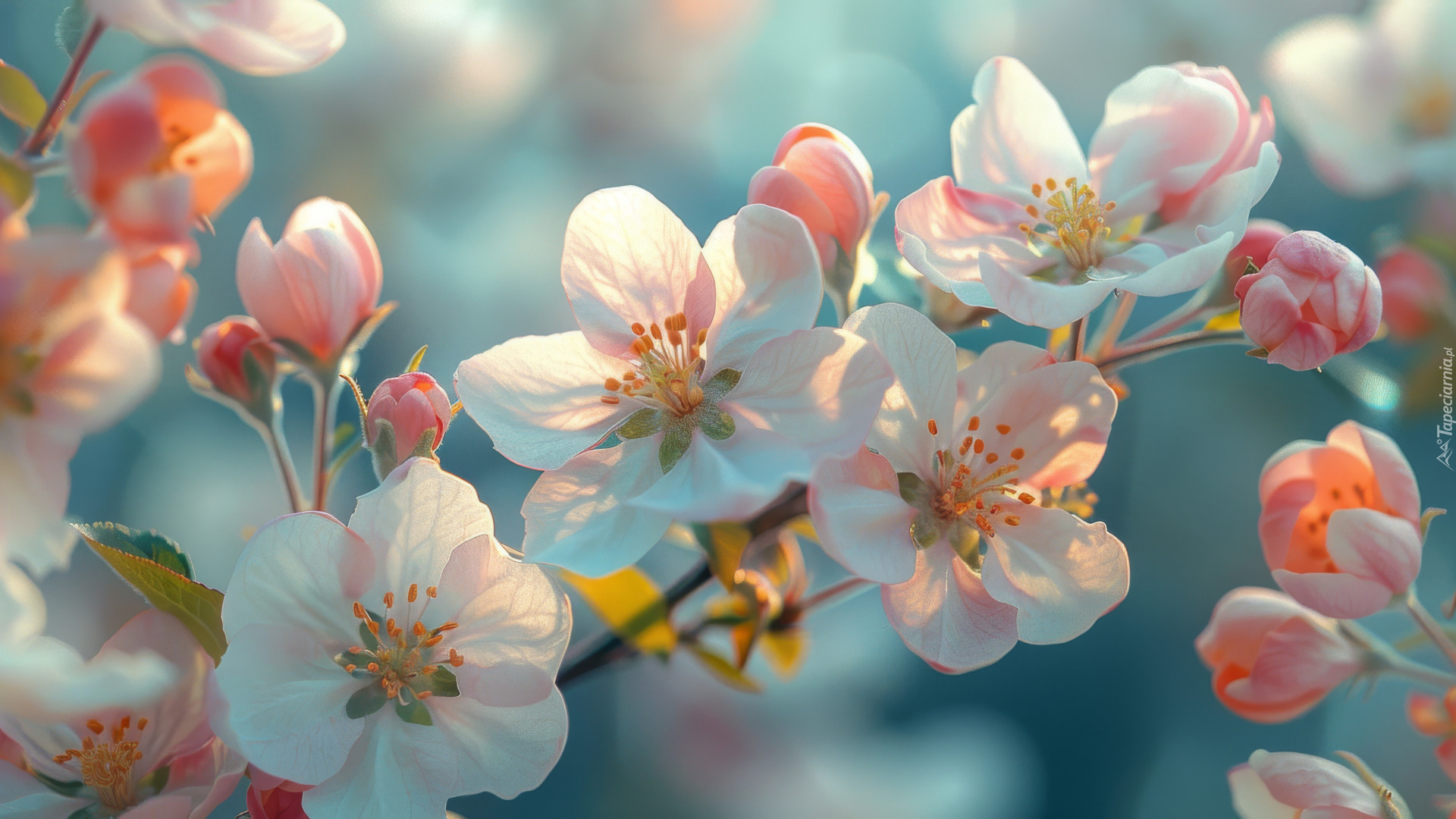Edytor tapety: Rozświetlona ukwiecona gałązka jabłoni
