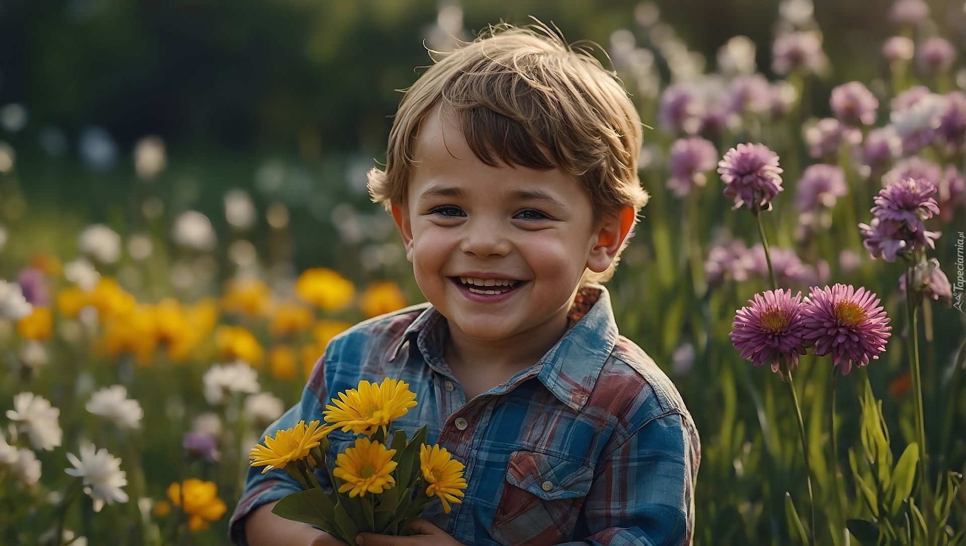 Edytor tapety: Uśmiechnięty chłopiec wśród łąkowych kwiatów