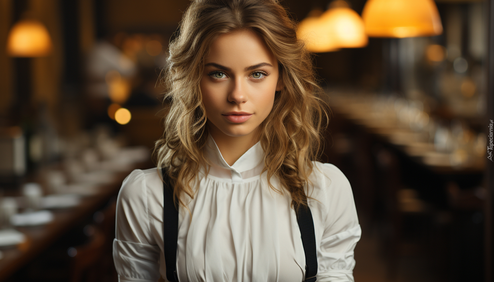 Edytor tapety: Kobieta w białej bluzce na tle lamp