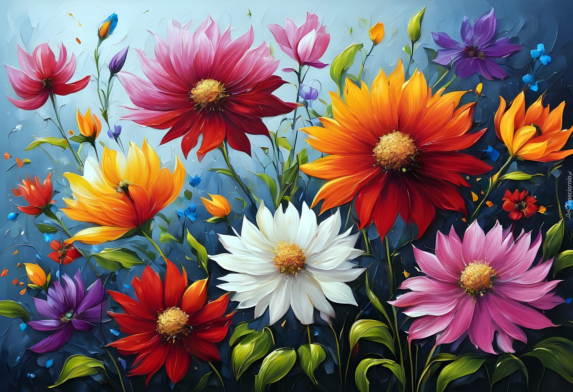 Edytor tapety: Kolorowe kwiaty na niebieskim tle w malarstwie