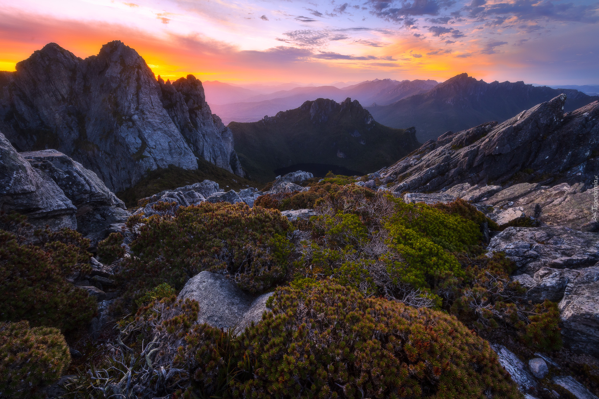Edytor tapety: Rozświetlone rośliny na skałach w górach