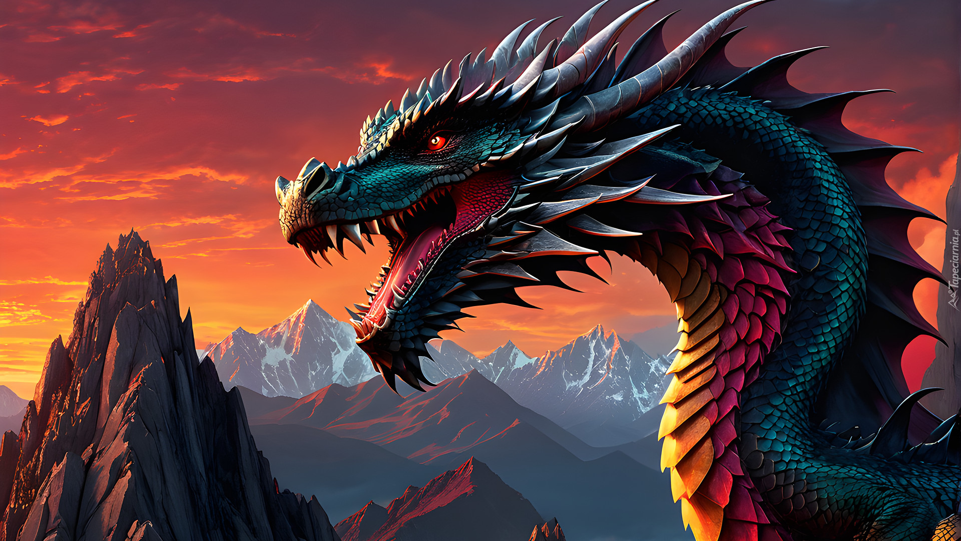 Edytor tapety: Smok z otwartym pyskiem na tle gór