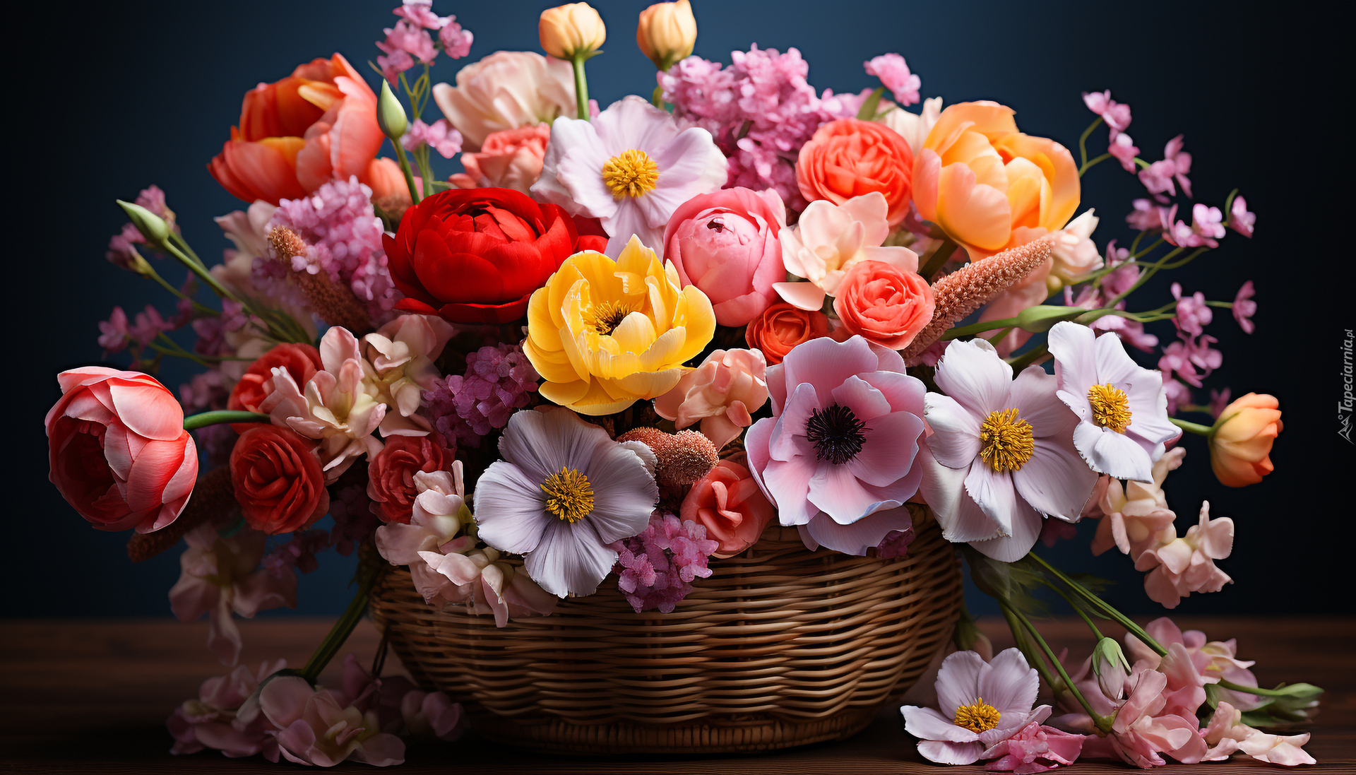 Edytor tapety: Kosz pełen różnych kolorowych kwiatów na ciemnym tle