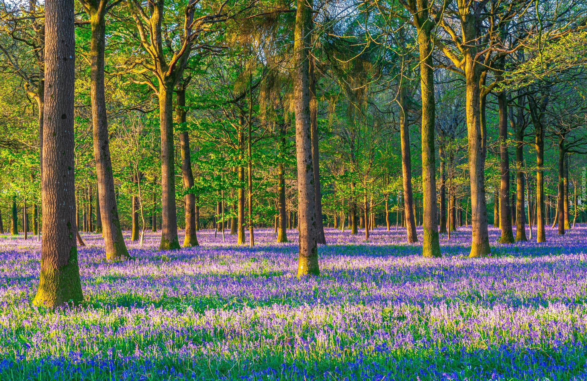 Edytor tapety: Rozświetlone hiacyntowce pod drzewami w lesie liściastym