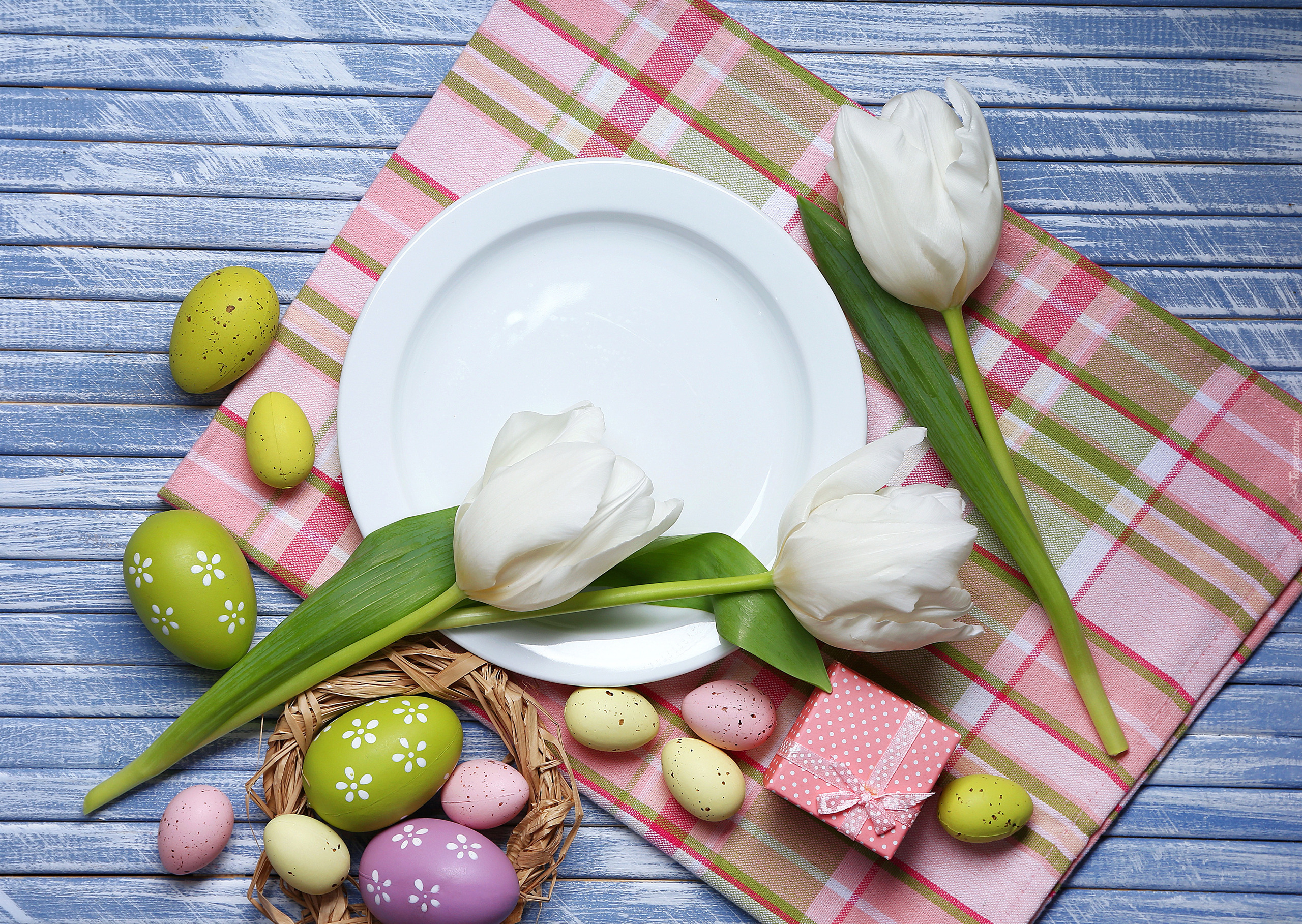 Edytor tapety: Białe tulipany na ścierce i talerzu obok pisanek