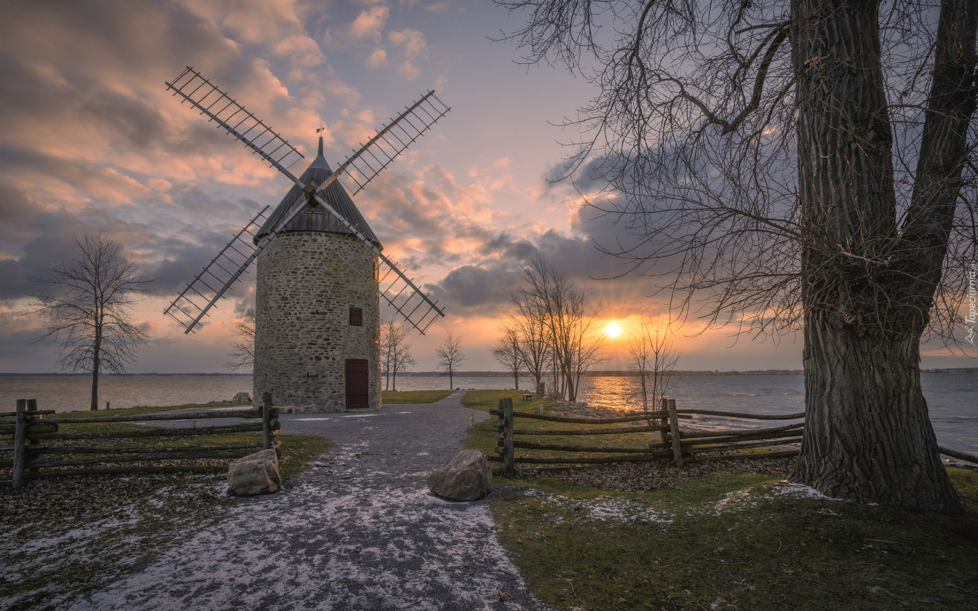 Edytor tapety: Wiatrak na brzegu morza w blasku zachodzącego słońca