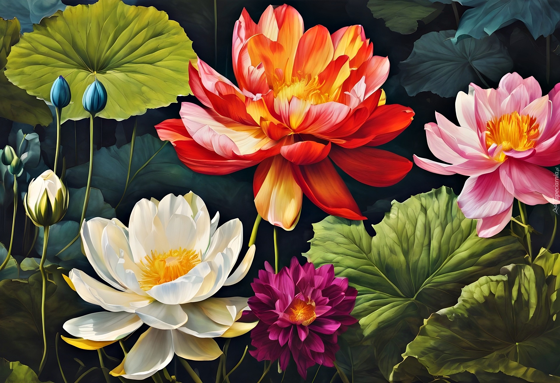 Edytor tapety: Pąki i rozwinięte kolorowe lilie wodne wśród liści