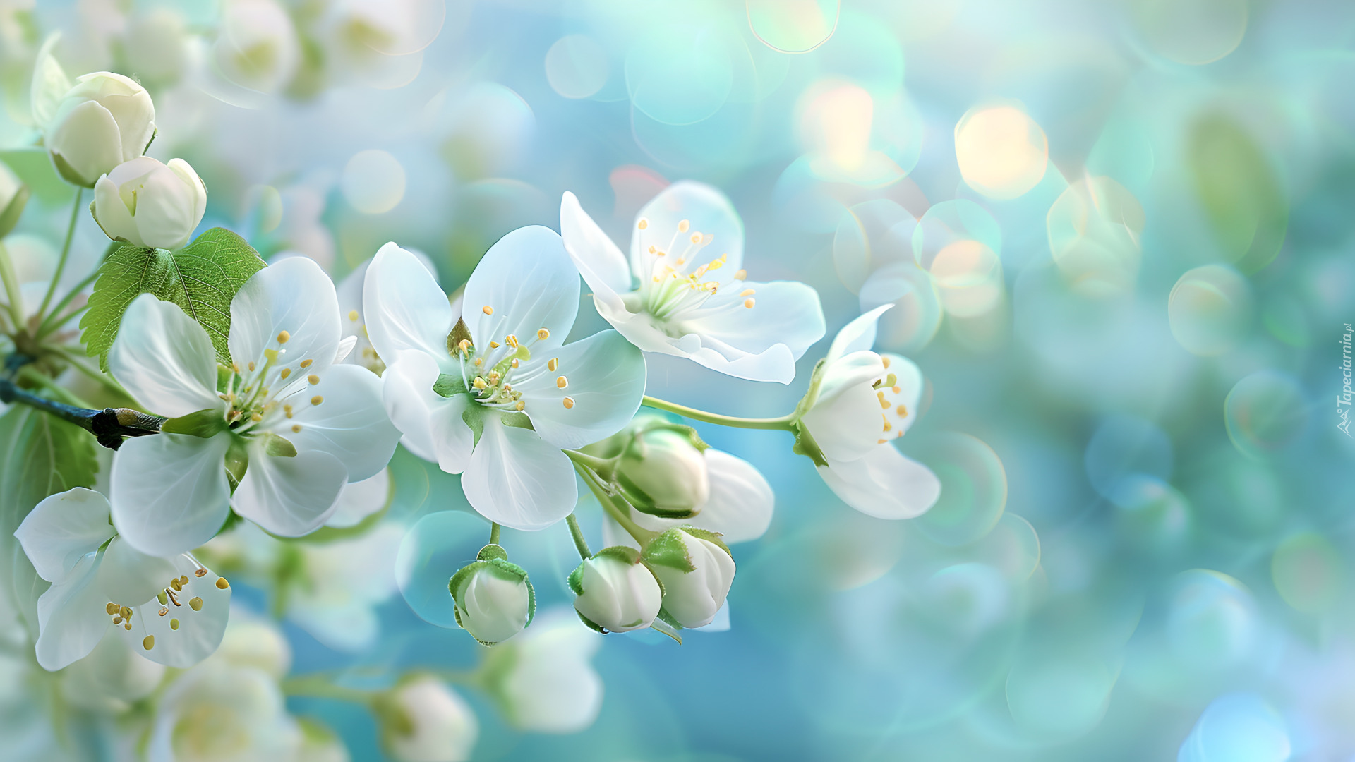 Edytor tapety: Pąki i białe kwiaty na gałązce drzewa owocowego