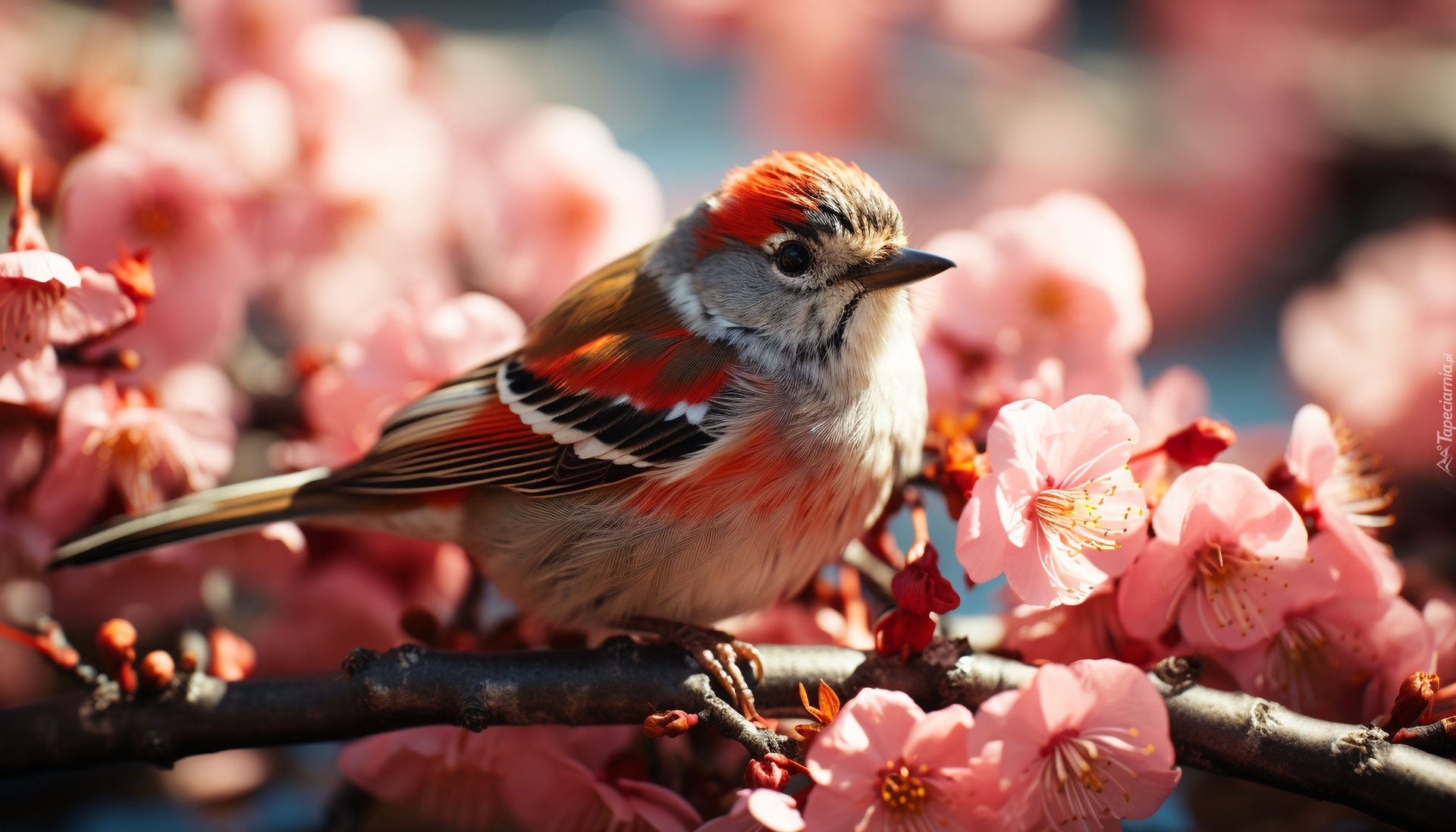Edytor tapety: Ptak na rozświetlonej ukwieconej gałązce drzewa owocowego