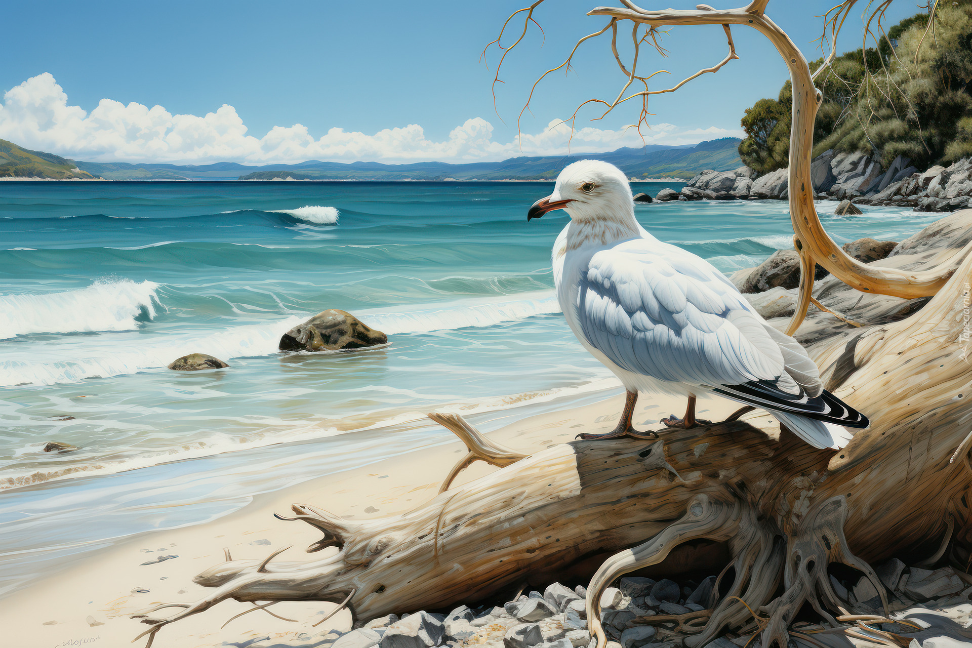 Edytor tapety: Mewa na konarze drzewa leżącego na plaży