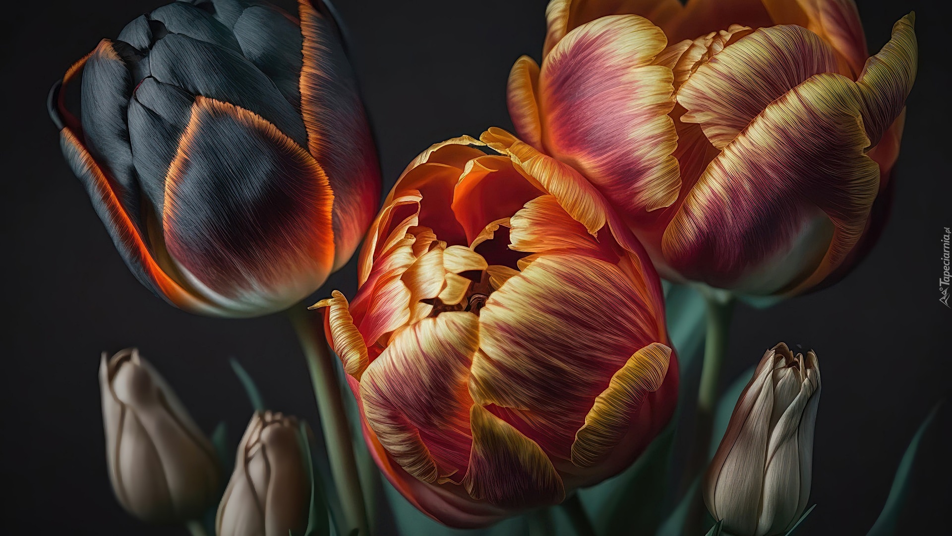Edytor tapety: Wielokolorowe tulipany na ciemnym tle
