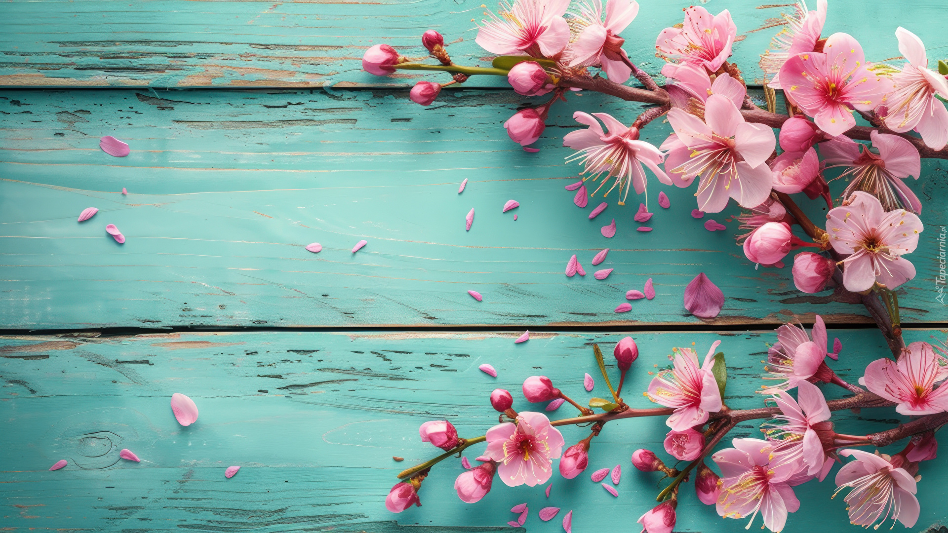 Edytor tapety: Ukwiecone gałązki na niebieskich deskach