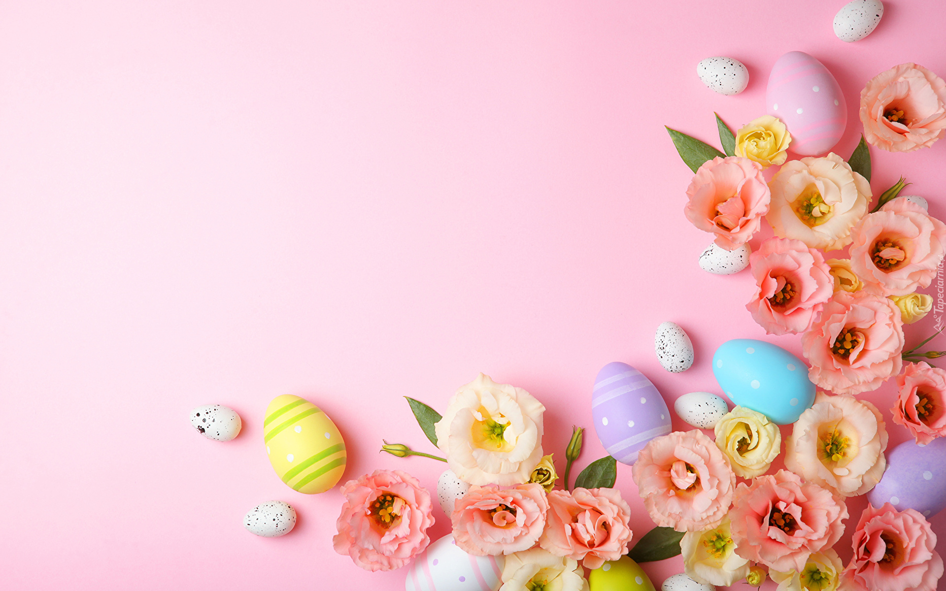 Edytor tapety: Kolorowe kwiatki z pisankami na różowym tle