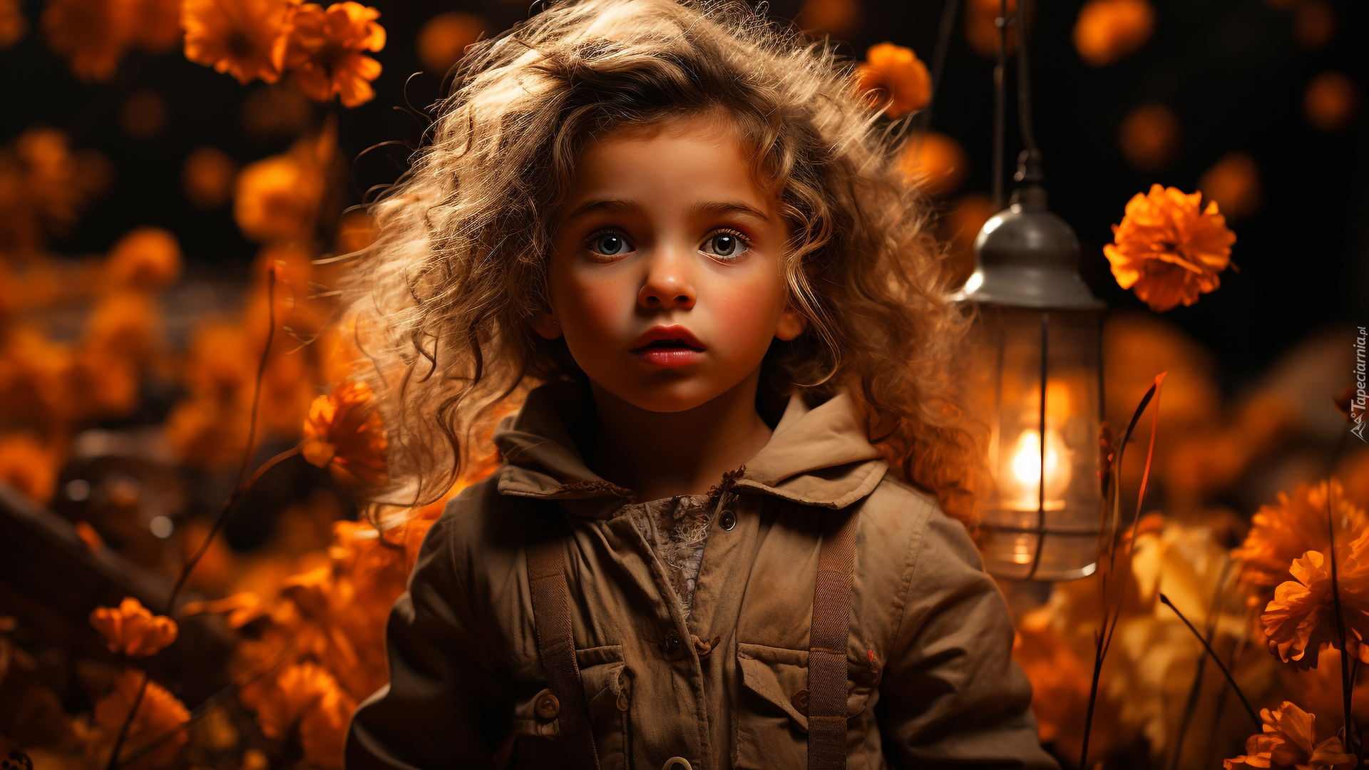 Edytor tapety: Lampion obok dziewczynki wśród kwiatów