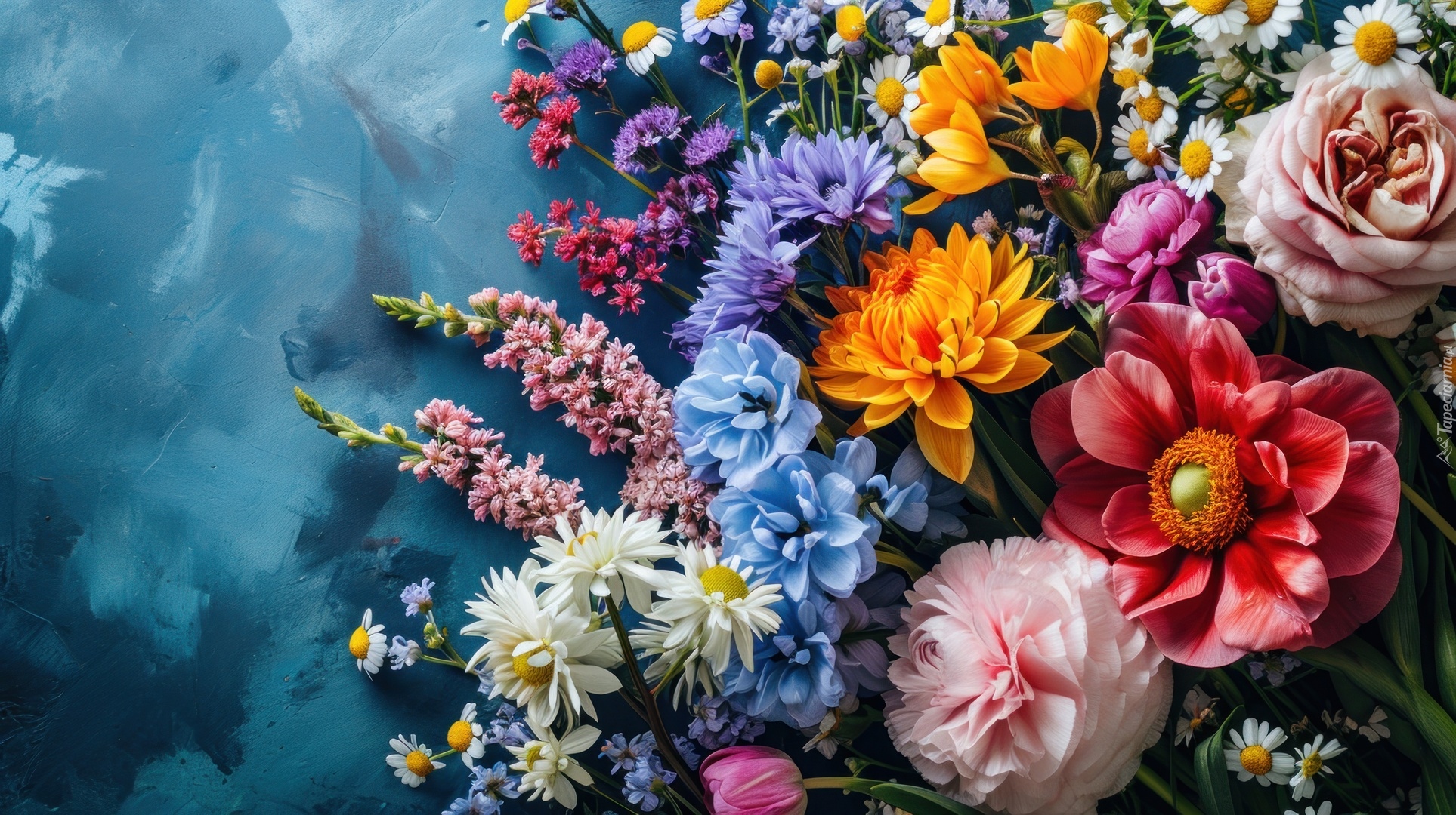 Edytor tapety: Różne kolorowe kwiaty na niebieskim tle