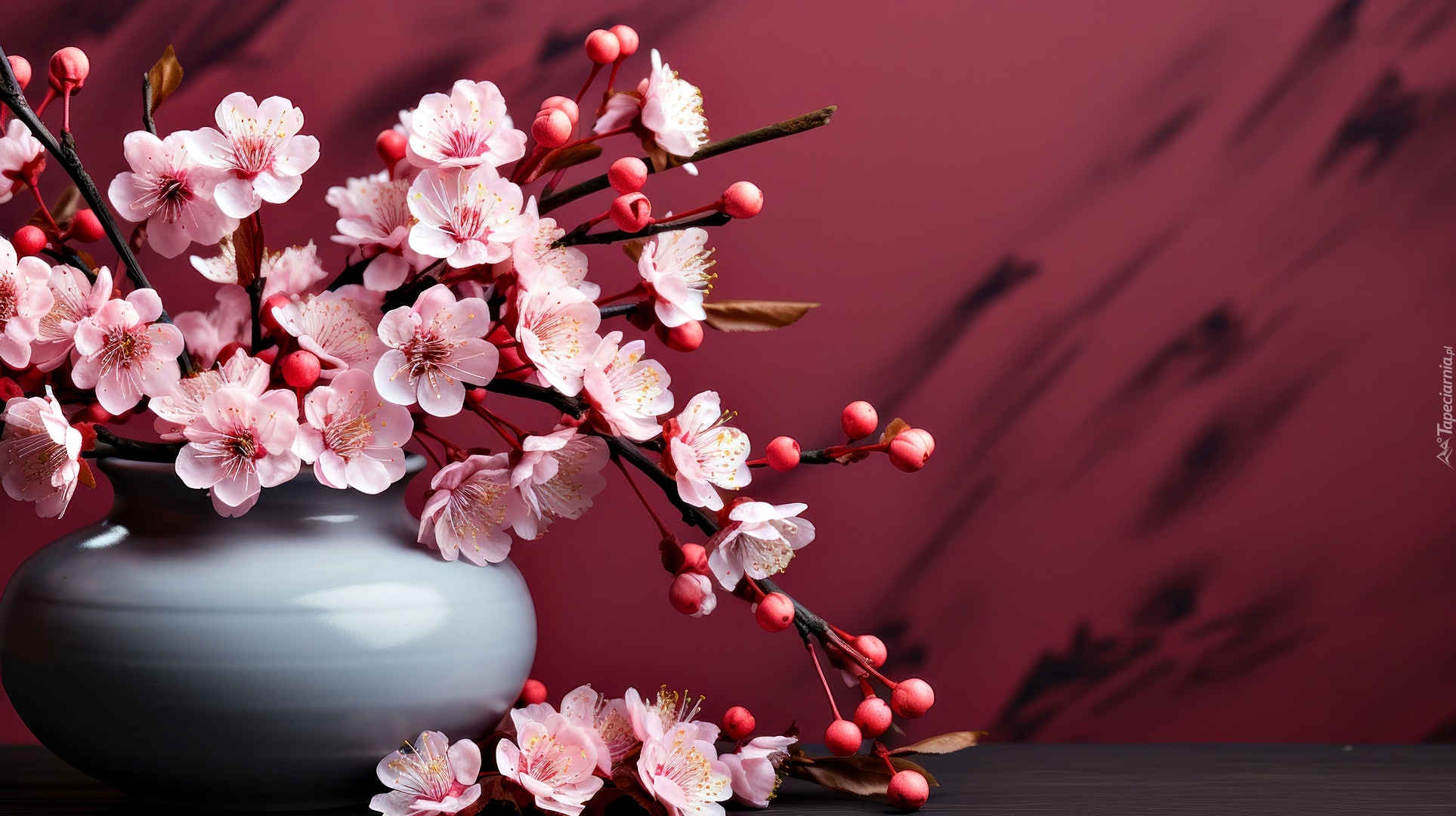 Edytor tapety: Różowe kwiatki na gałązkach w białym wazonie