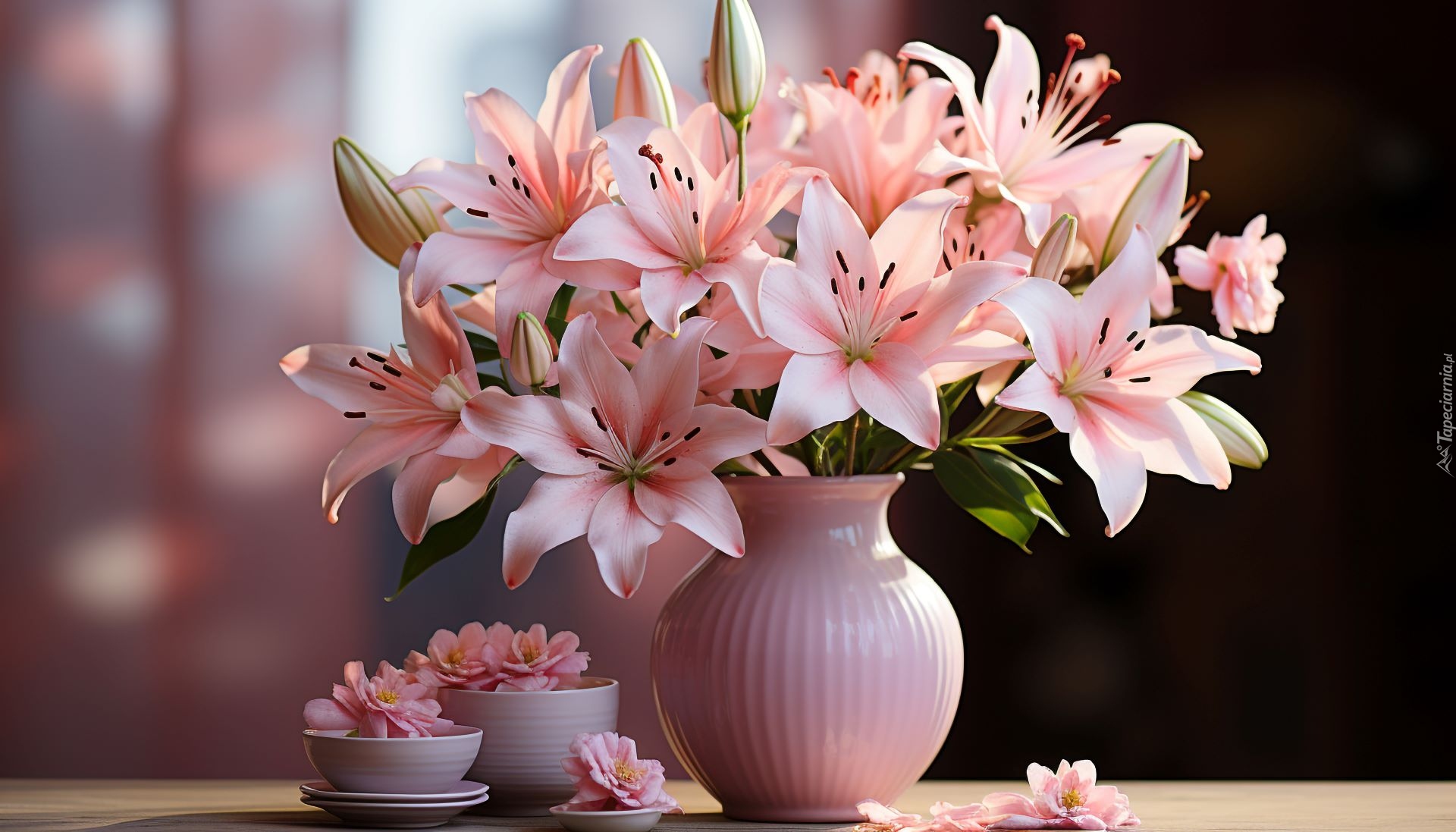 Edytor tapety: Różowe lilie w wazonie