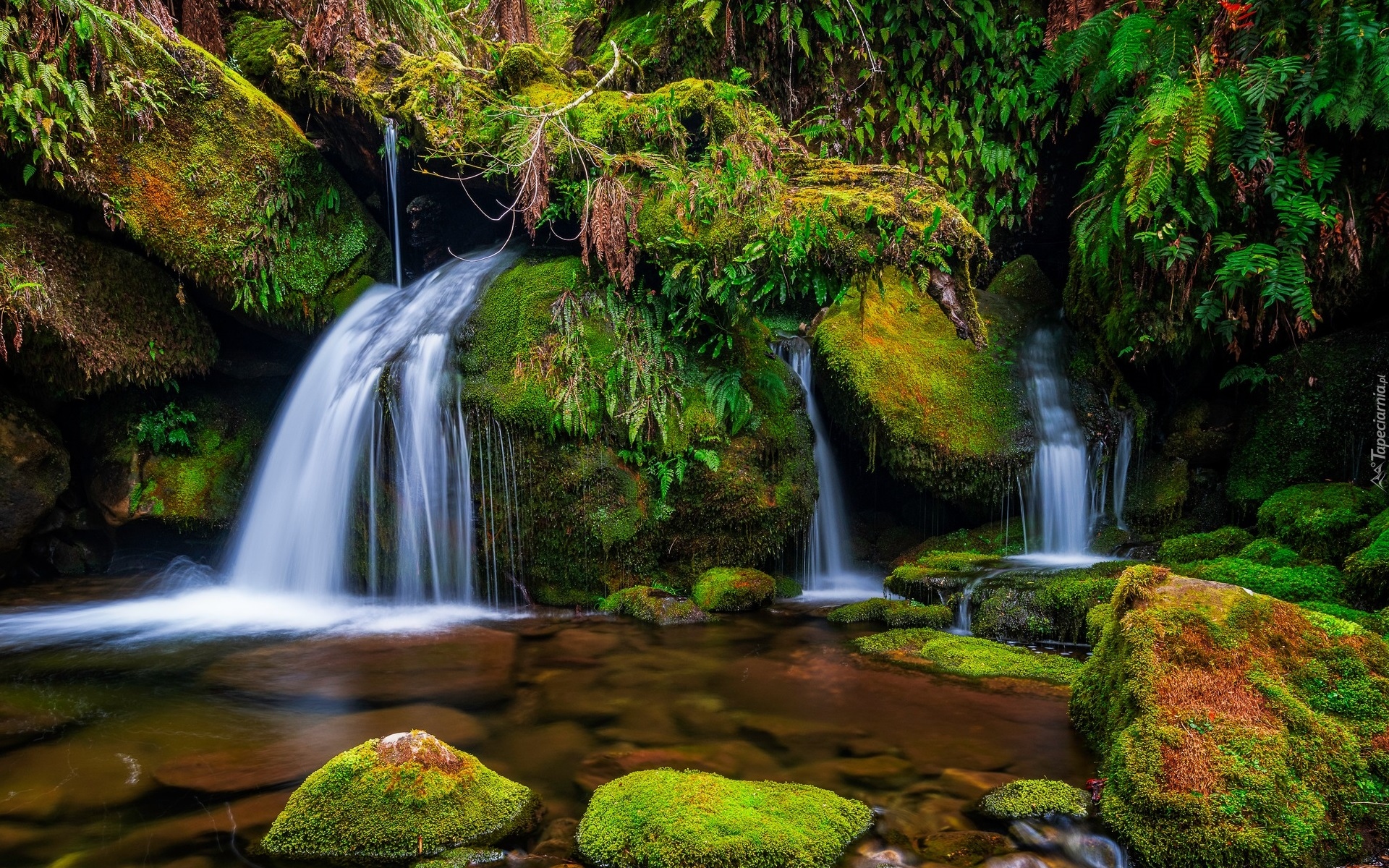 Edytor tapety: Rośliny i drzewa przy wodospadzie na omszałych skałach
