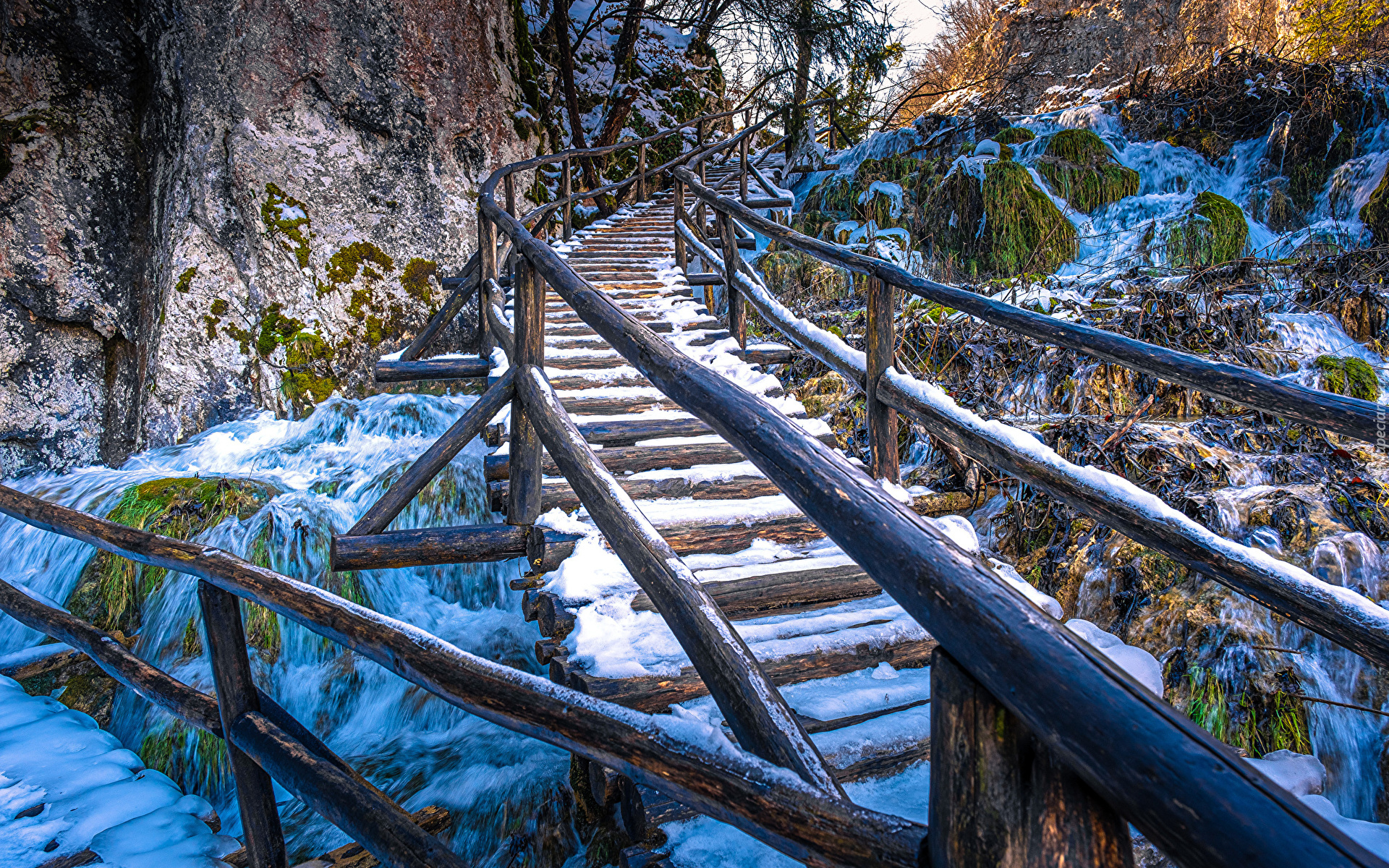 Edytor tapety: Drewniane schody nad rzeką w górach