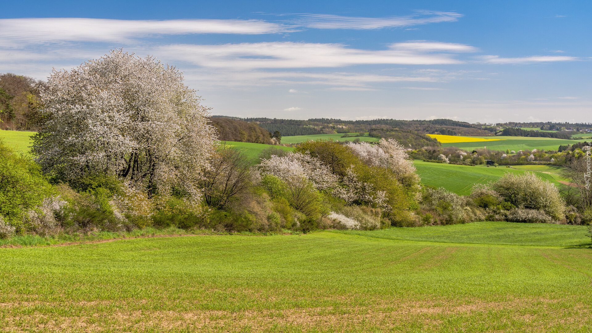 Edytor tapety: Pole i kwitnące drzewa na wzgórzu