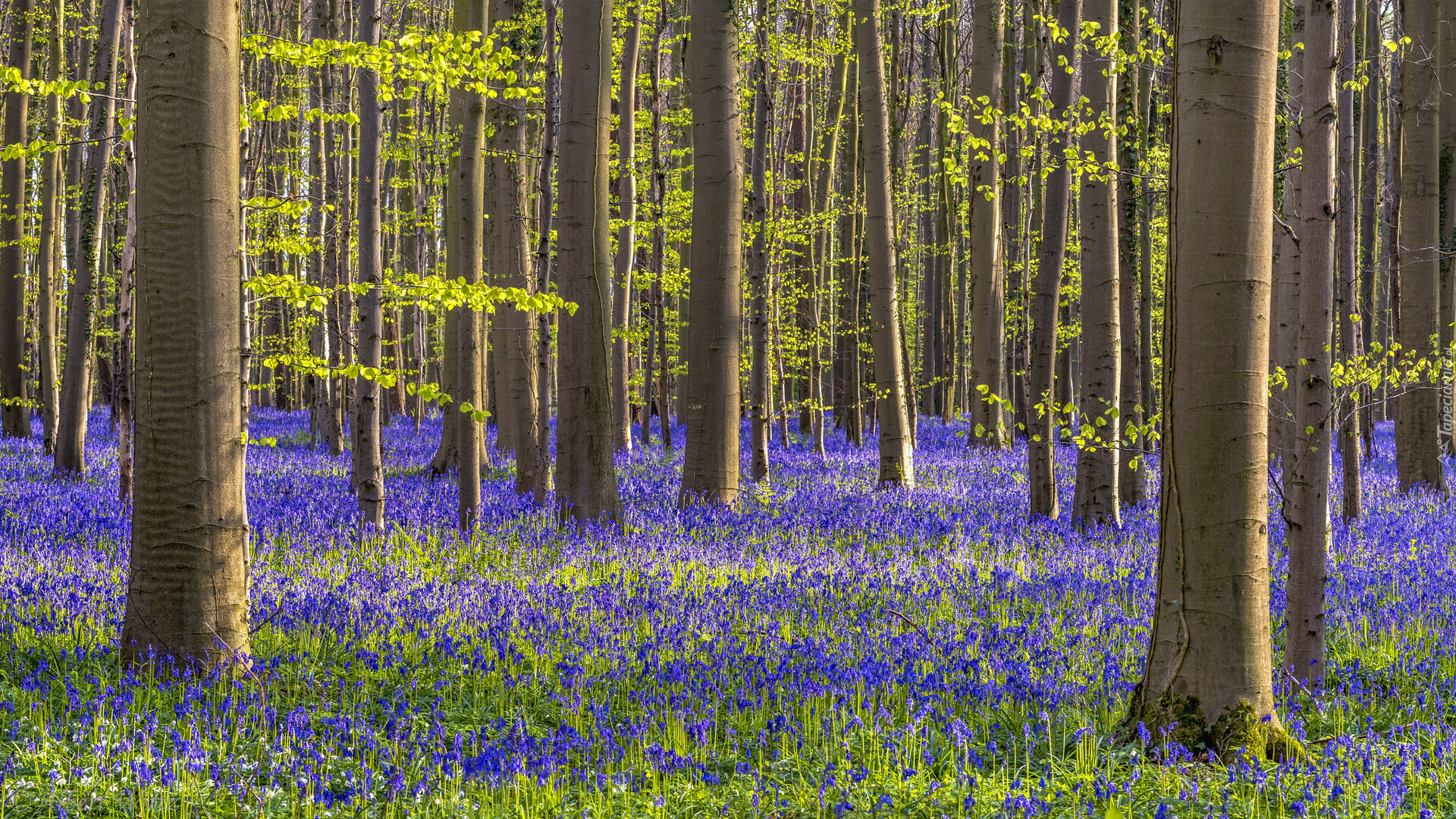 Edytor tapety: Hiacyntowce w słonecznym lesie liściastym