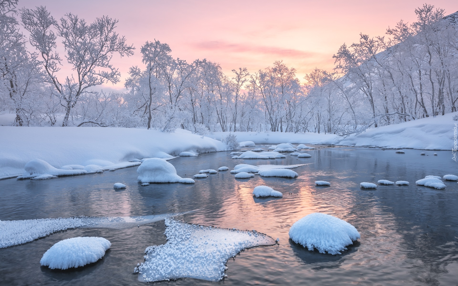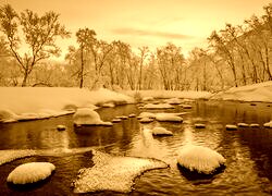 Edytor tapety: Ośnieżone drzewa w śniegu nad rzeką o poranku