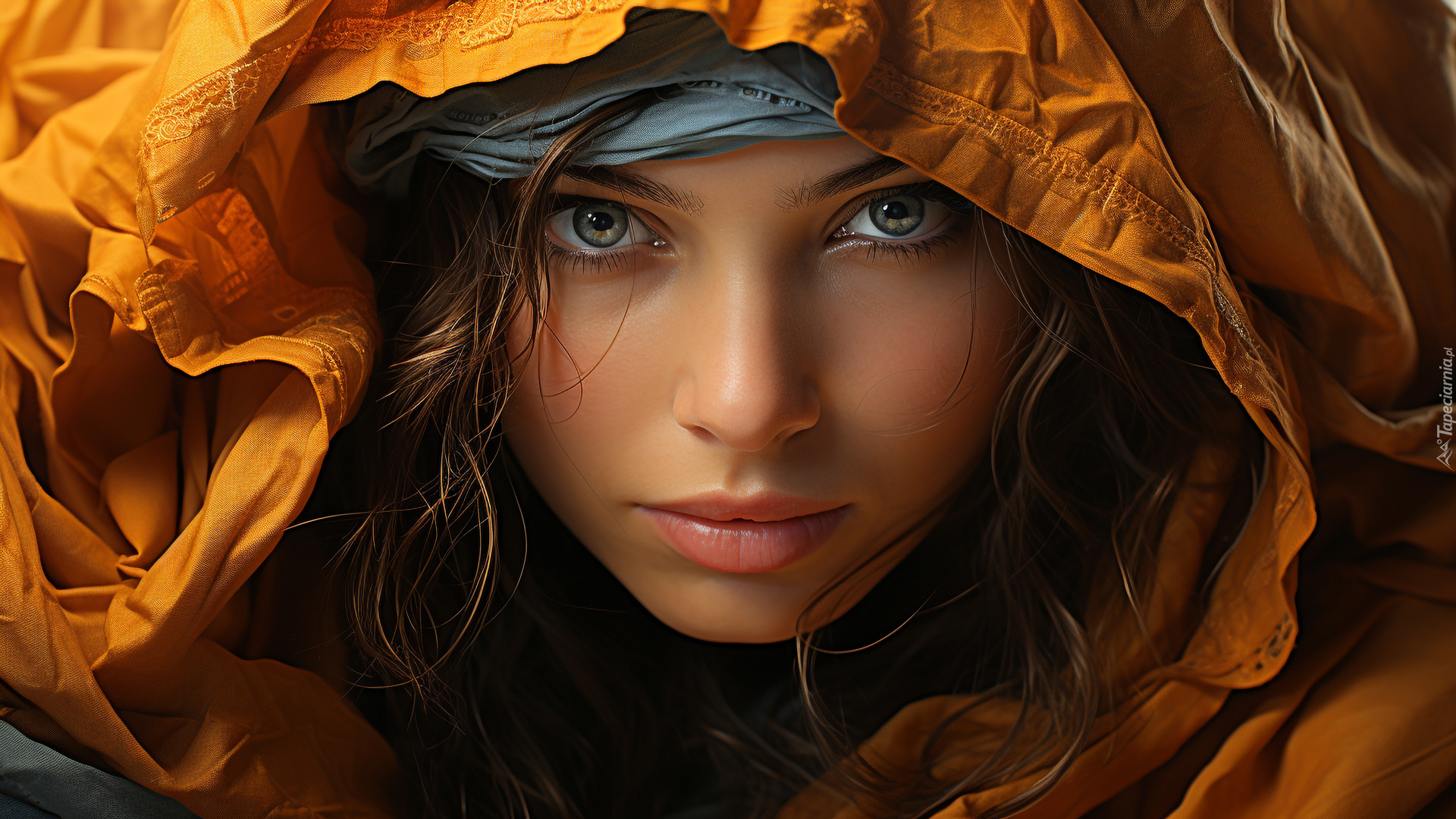 Edytor tapety: Twarz kobiety w pomarańczowym kapturze w zbliżeniu