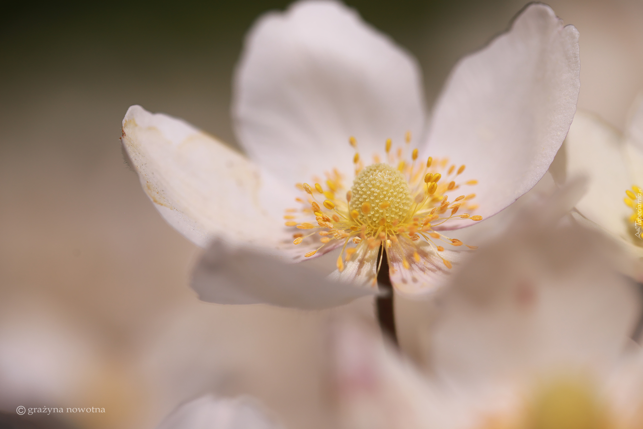 Edytor tapety: Rozkwitnięty biały zawilec na rozmytym tle