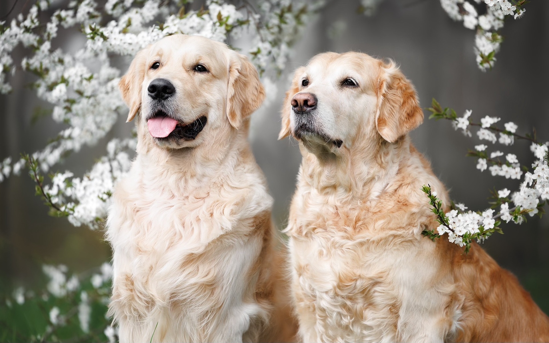 Edytor tapety: Dwa golden retrievery pod ukwieconymi gałązkami