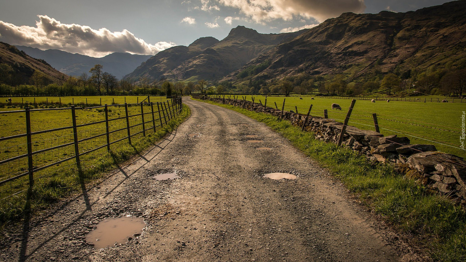 Edytor tapety: Ogrodzona droga pomiędzy pastwiskami