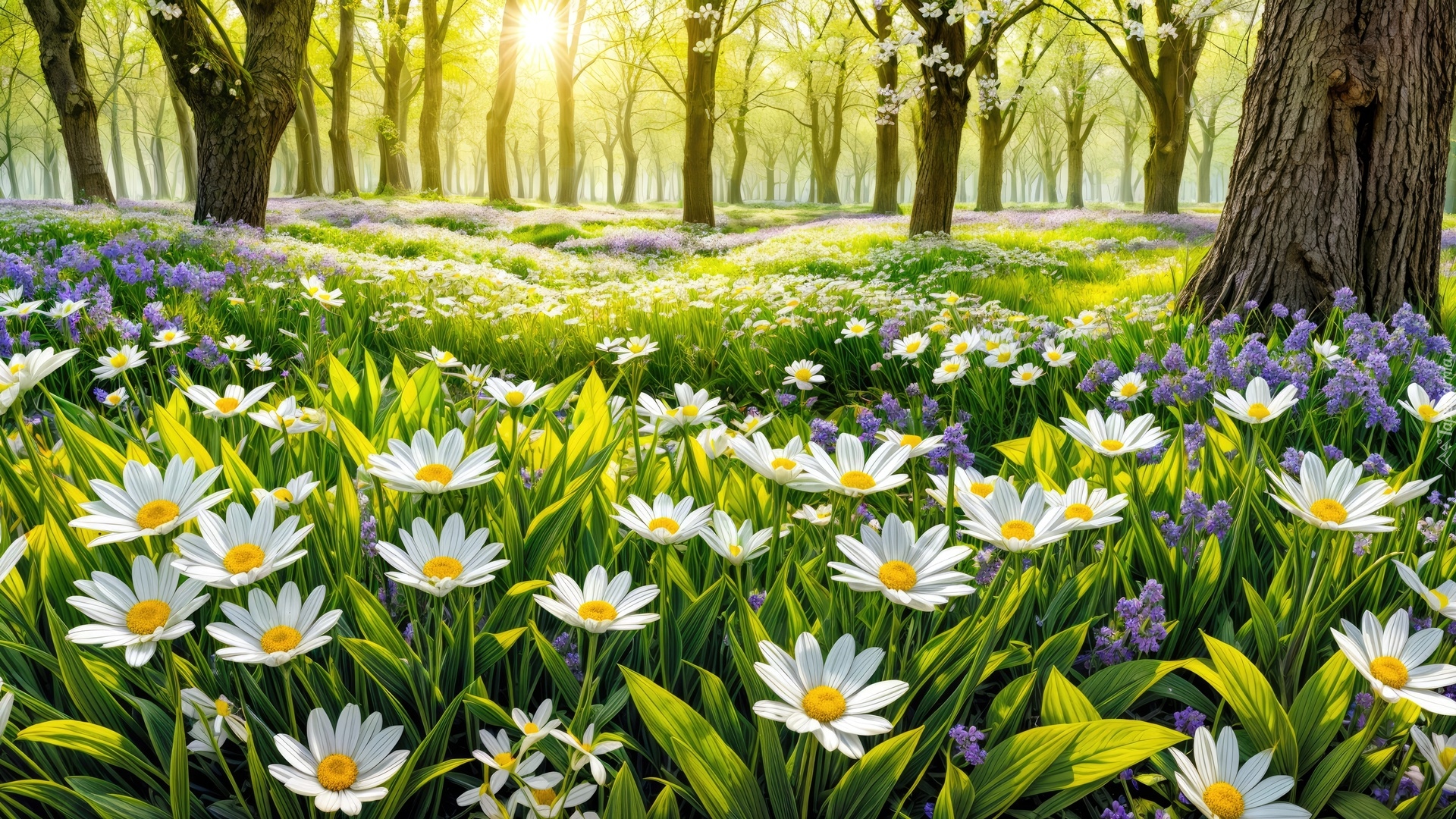 Edytor tapety: Ukwiecona łąka leśna w blasku słońca